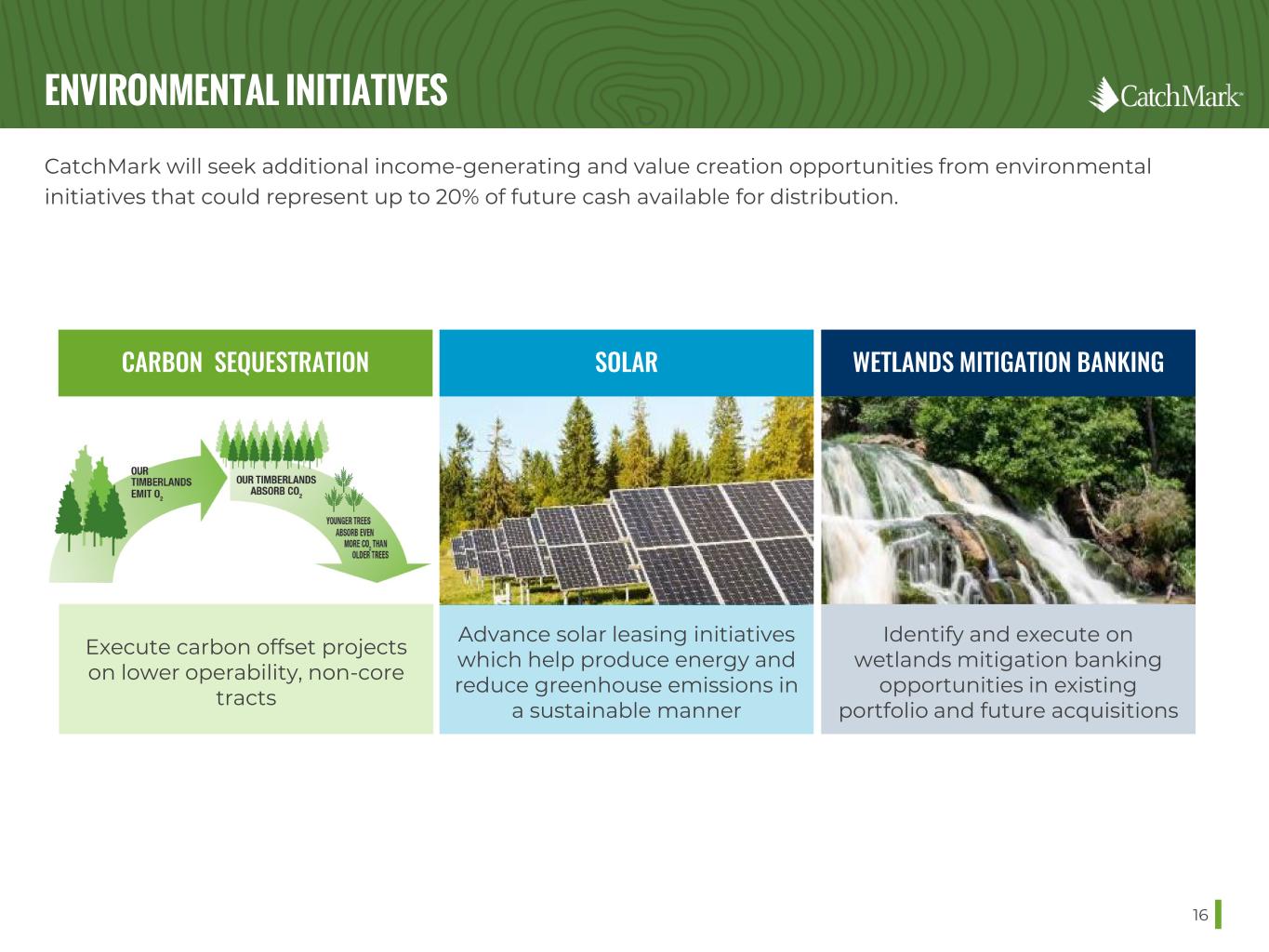 DISCIPLINED ACQUISITION PROCESS 15 CatchMark employs a disciplined five-step process in analyzing and assessing potential new investments to help ensure prudent decision making and successful long-term outcomes. MILL/ MARKET STUDY MODELING/ ANALYSIS FIELD DUE DILIGENCE UPDATE MODELING/ ANALYSIS FORMALIZED APPROVAL • Growth/drain ratios • Mill consumption and end-use products • Cost curves of mills • Comp sales analysis • Harvest modeling and DCF analysis with management cost and CAPEX assumptions, reviewing: • Stocking levels and age class distribution • Allocation of pine plantation acres • Site Index • Operability • Harvest Variability • CAD yield & IRR analysis • Harvest EBITDA / Acre • Wood/Fiber Supply Agreements • Environmental Opportunities • Detailed inventory measurement, verification • Evaluate site productivity and historical management • Update all analyses following field due diligence • Rigorous review by and necessary approval from Executive Committee and Board of Directors 1. 2. 3. 4. 5.
