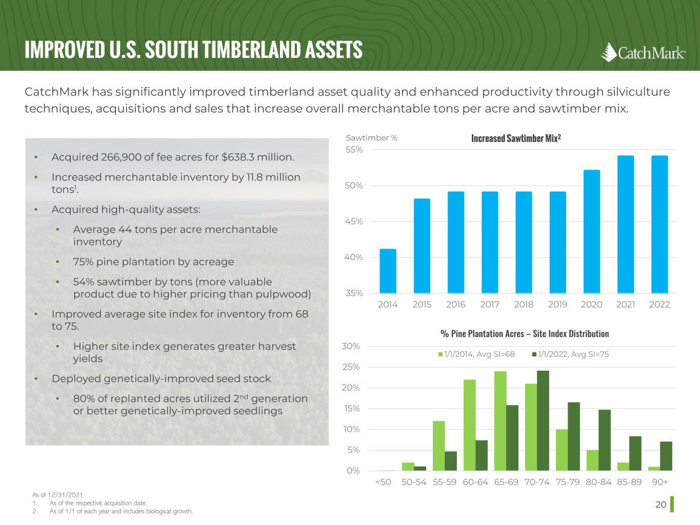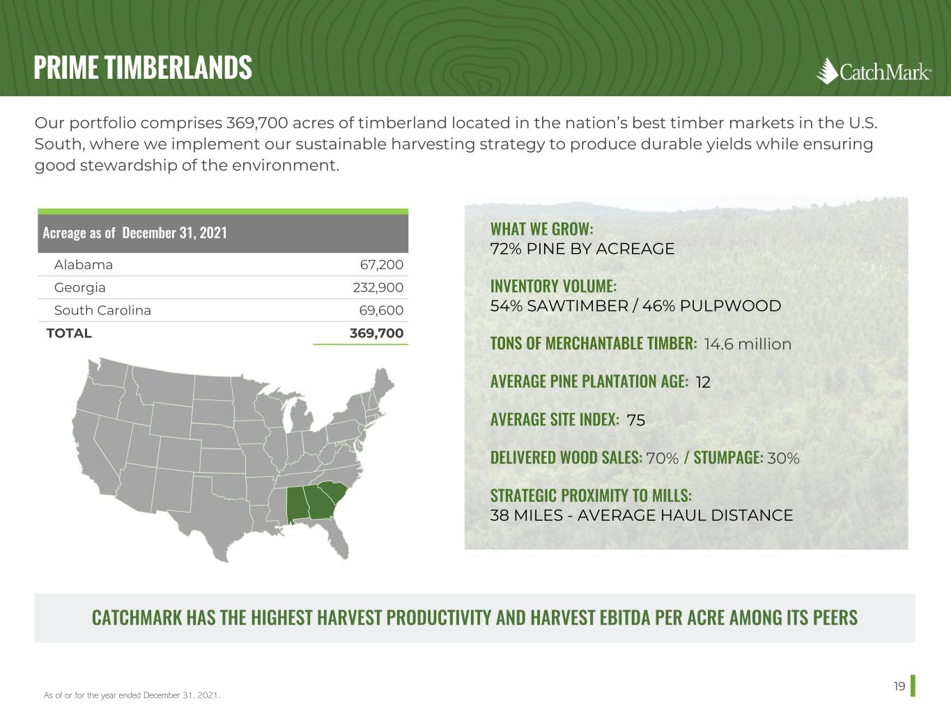 PRIME TIMBERLANDS 19 As of or for the year ended December 31, 2021. Acreage as of December 31, 2021 Alabama 67,200 Georgia 232,900 South Carolina 69,600 TOTAL 369,700 Our portfolio comprises 369,700 acres of timberland located in the nation’s best timber markets in the U.S. South, where we implement our sustainable harvesting strategy to produce durable yields while ensuring good stewardship of the environment. WHAT WE GROW: 72% PINE BY ACREAGE INVENTORY VOLUME: 54% SAWTIMBER / 46% PULPWOOD TONS OF MERCHANTABLE TIMBER: 14.6 million AVERAGE PINE PLANTATION AGE: 12 AVERAGE SITE INDEX: 75 DELIVERED WOOD SALES: 70% / STUMPAGE: 30% STRATEGIC PROXIMITY TO MILLS: 38 MILES - AVERAGE HAUL DISTANCE CATCHMARK HAS THE HIGHEST HARVEST PRODUCTIVITY AND HARVEST EBITDA PER ACRE AMONG ITS PEERS