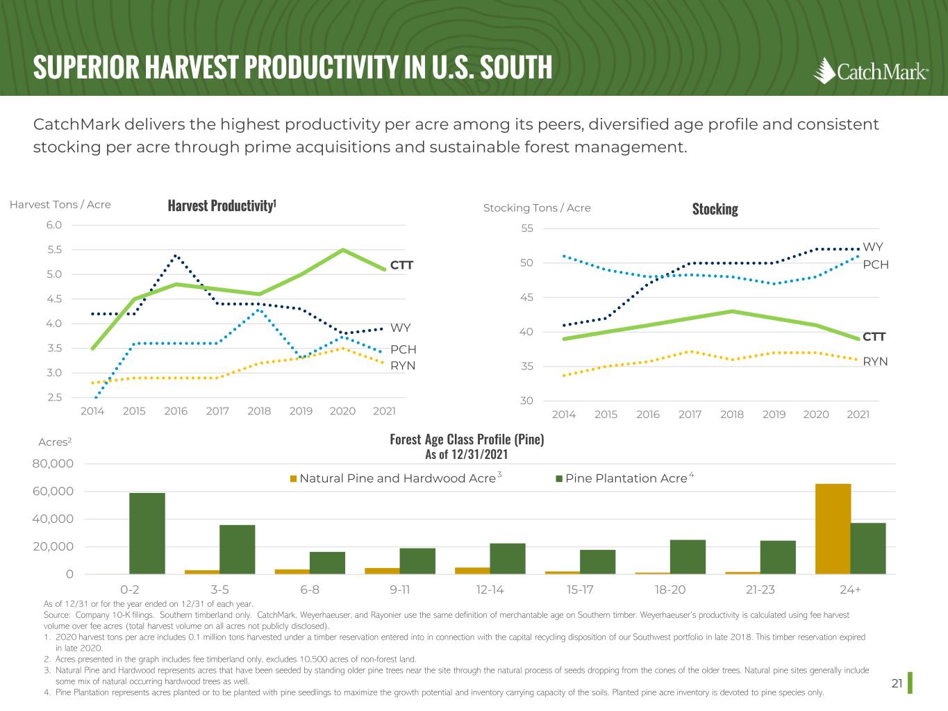 IMPROVED U.S. SOUTH TIMBERLAND ASSETS 20 CatchMark has significantly improved timberland asset quality and enhanced productivity through silviculture techniques, acquisitions and sales that increase overall merchantable tons per acre and sawtimber mix. • Acquired 266,900 of fee acres for $638.3 million. • Increased merchantable inventory by 11.8 million tons1. • Acquired high-quality assets: • Average 44 tons per acre merchantable inventory • 75% pine plantation by acreage • 54% sawtimber by tons (more valuable product due to higher pricing than pulpwood) • Improved average site index for inventory from 68 to 75. • Higher site index generates greater harvest yields • Deployed genetically-improved seed stock • 80% of replanted acres utilized 2nd generation or better genetically-improved seedlings As of 12/31/2021. 1. As of the respective acquisition date. 2. As of 1/1 of each year and includes biological growth. 35% 40% 45% 50% 55% 2014 2015 2016 2017 2018 2019 2020 2021 2022 Increased Sawtimber Mix2Sawtimber % 0% 5% 10% 15% 20% 25% 30% <50 50-54 55-59 60-64 65-69 70-74 75-79 80-84 85-89 90+ 1/1/2014, Avg SI=68 1/1/2022, Avg SI=75 % Pine Plantation Acres – Site Index Distribution