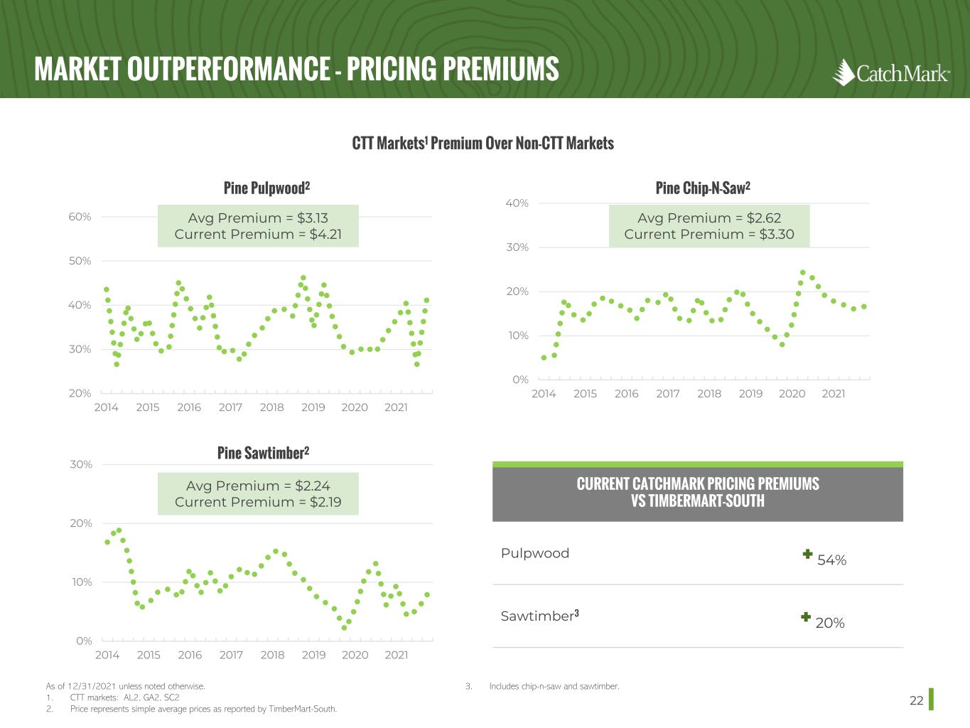 SUPERIOR HARVEST PRODUCTIVITY IN U.S. SOUTH 21 CatchMark delivers the highest productivity per acre among its peers, diversified age profile and consistent stocking per acre through prime acquisitions and sustainable forest management. As of 12/31 or for the year ended on 12/31 of each year. Source: Company 10-K filings. Southern timberland only. CatchMark, Weyerhaeuser, and Rayonier use the same definition of merchantable age on Southern timber. Weyerhaeuser’s productivity is calculated using fee harvest volume over fee acres (total harvest volume on all acres not publicly disclosed). 1. 2020 harvest tons per acre includes 0.1 million tons harvested under a timber reservation entered into in connection with the capital recycling disposition of our Southwest portfolio in late 2018. This timber reservation expired in late 2020. 2. Acres presented in the graph includes fee timberland only, excludes 10,500 acres of non-forest land. 3. Natural Pine and Hardwood represents acres that have been seeded by standing older pine trees near the site through the natural process of seeds dropping from the cones of the older trees. Natural pine sites generally include some mix of natural occurring hardwood trees as well. 4. Pine Plantation represents acres planted or to be planted with pine seedlings to maximize the growth potential and inventory carrying capacity of the soils. Planted pine acre inventory is devoted to pine species only. 2.5 3.0 3.5 4.0 4.5 5.0 5.5 6.0 2014 2015 2016 2017 2018 2019 2020 2021 CTT WY RYN PCH Harvest Tons / Acre Harvest Productivity1 30 35 40 45 50 55 2014 2015 2016 2017 2018 2019 2020 2021 CTT WY RYN PCH Stocking Tons / Acre Stocking 0 20,000 40,000 60,000 80,000 0-2 3-5 6-8 9-11 12-14 15-17 18-20 21-23 24+ Natural Pine and Hardwood Acre Pine Plantation Acre Forest Age Class Profile (Pine) As of 12/31/2021 Acres2 3 4