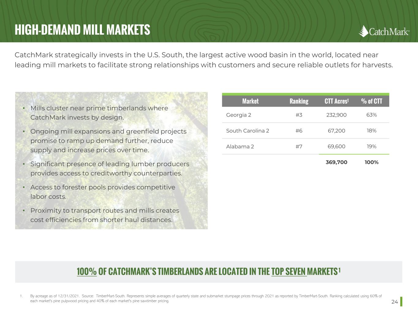 TABLE OF CONTENTS In this presentation (1) “CatchMark” refers to CatchMark Timber Trust, Inc., a Maryland corporation that has elected to be taxed as a real estate investment trust (NYSE: CTT), (2) “Triple T” refers to TexMark Timber Treasury, L.P., a Delaware limited partnership that is a joint venture that was managed by CatchMark and in which CatchMark held a common limited partnership interest through October 14, 2021, (3) “Dawsonville Bluffs” refers to Dawsonville Bluffs, LLC, a Delaware limited liability company that is a joint venture managed by CatchMark and in which CatchMark holds a 50% limited liability company interest, and (4) “IPO” refers to CatchMark’s initial listed offering in December 2013. 3 SECTION PAGE CatchMark Overview 4 Strategic Priorities to Drive Growth 11 Prime Timberlands 18 High-Demand Mill Markets 23 Superior Stewardship 29 Capital Strategy 36 Commitment to ESG Best Practices 39 Summary 47 Appendix 50
