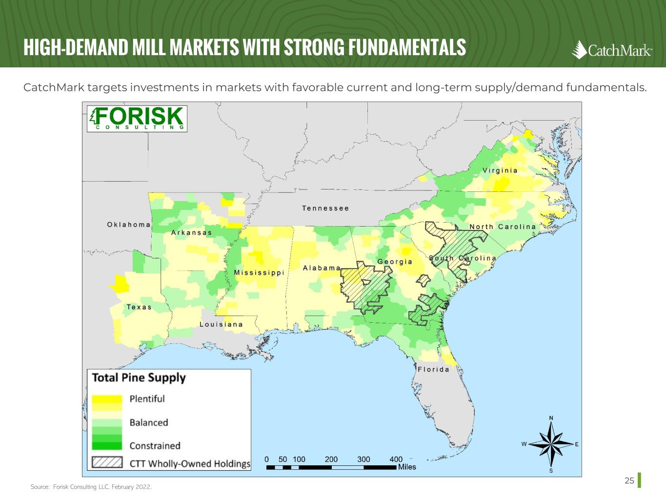 HIGH-DEMAND MILL MARKETS 24 CatchMark strategically invests in the U.S. South, the largest active wood basin in the world, located near leading mill markets to facilitate strong relationships with customers and secure reliable outlets for harvests. 1. By acreage as of 12/31/2021. Source: TimberMart-South. Represents simple averages of quarterly state and submarket stumpage prices through 2021 as reported by TimberMart-South. Ranking calculated using 60% of each market's pine pulpwood pricing and 40% of each market's pine sawtimber pricing. • Mills cluster near prime timberlands where CatchMark invests by design. • Ongoing mill expansions and greenfield projects promise to ramp up demand further, reduce supply and increase prices over time. • Significant presence of leading lumber producers provides access to creditworthy counterparties. • Access to forester pools provides competitive labor costs. • Proximity to transport routes and mills creates cost efficiencies from shorter haul distances. Market Ranking CTT Acres1 % of CTT Georgia 2 #3 232,900 63% South Carolina 2 #6 67,200 18% Alabama 2 #7 69,600 19% 369,700 100% 100% OF CATCHMARK’S TIMBERLANDS ARE LOCATED IN THE TOP SEVEN MARKETS 1