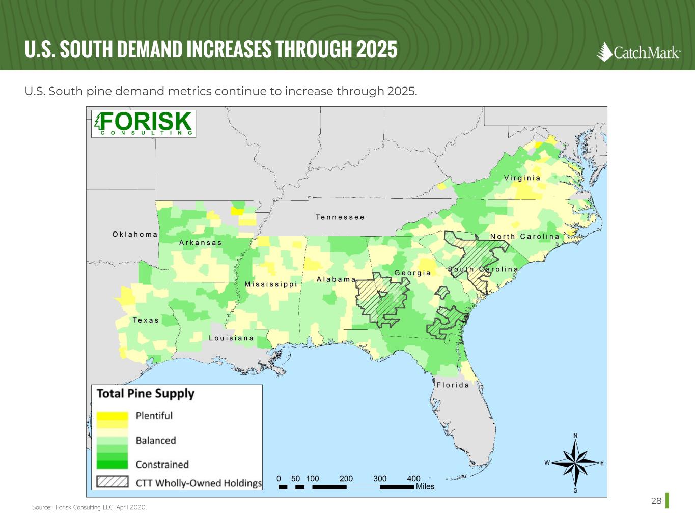 GROWING DEMAND IN CATCHMARK MARKETS 27 Source: Forisk Consulting LLC, February 2022. CURRENT DEMAND # of Mills Consumption (M tons) Pulpwood 41 13.0 Pine Grade 66 8.4 TOTAL 107 21.4 INCREMENTAL DEMAND # of Mills Consumption (M tons) Pulpwood 1 0.2 Pine Grade 0 0.5 TOTAL 1 0.7 COASTAL CURRENT DEMAND # of Mills Consumption (M tons) Pulpwood 39 9.1 Pine Grade 57 8.6 TOTAL 96 17.7 INCREMENTAL DEMAND # of Mills Consumption (M tons) Pulpwood 1 0.3 Pine Grade 1 1.0 TOTAL 2 1.3 SOUTH CENTRAL CURRENT DEMAND # of Mills Consumption (M tons) Pulpwood 56 11.4 Pine Grade 66 9.3 TOTAL 122 20.7 INCREMENTAL DEMAND # of Mills Consumption (M tons) Pulpwood 2 1.0 Pine Grade 0 0.3 TOTAL 2 1.3 MID-ATLANTIC Note: New mills includes East Alabama Lumber reopening. Note: New mils includes West Fraser reopening the Fairfax, SC OSB mill.
