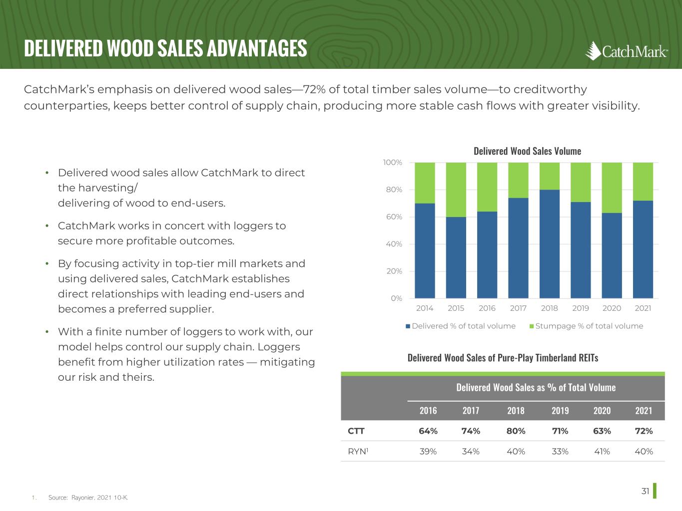 SUPERIOR STEWARDSHIP THROUGH DISCIPLINED MANAGEMENT 30 Through disciplined management and superior stewardship, we seek to maximize stable and growing cash flow through all phases of the business cycle and have outperformed industry peers significantly on a Harvest EBITDA per acre basis . 1. See definition of Adjusted EBITDA, a non-GAAP measure, reconciliation of net income (loss) to Adjusted EBITDA and Adjusted EBITDA by Segment in Appendix. NCREIF data includes all segments of EBITDA. • Actively manage timberlands to realize maximum organic growth and harvest profitability through sustainable practices • Utilize best-in-class foresters to manage holdings • Proactively manage customers and prospective end-users • Maximize revenues by strategically utilizing: • Supply agreements • Delivered wood sales • Harvest mix • Identify, prioritize and market HBU property sale • Divest non-core timberlands • Generate non-timber revenue from: • Environmental initiatives: carbon sequestration, wetlands mitigation banking, solar projects • Hunting/recreational leases • Asset management $35 $40 $45 $50 $55 $60 $65 $70 $75 $80 $85 2015 2016 2017 2018 2019 2020 2021 INDUSTRY OUTPERFORMANCE U.S. South Harvest EBITDA1 Per Acre (2015 - 2021) CTT RYN WY PCH NCREIF SIGNIFICANTLY OUTPERFORMS INDUSTRY PEERS ON A HARVEST EBITDA PER ACRE BASIS IN U.S. SOUTH