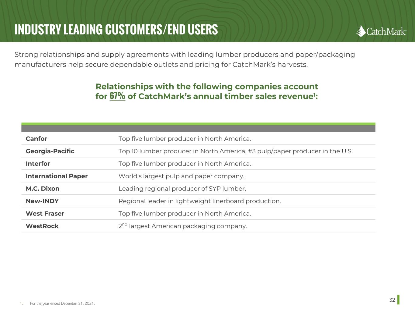 DELIVERED WOOD SALES ADVANTAGES 31 CatchMark’s emphasis on delivered wood sales—72% of total timber sales volume—to creditworthy counterparties, keeps better control of supply chain, producing more stable cash flows with greater visibility. • Delivered wood sales allow CatchMark to direct the harvesting/ delivering of wood to end-users. • CatchMark works in concert with loggers to secure more profitable outcomes. • By focusing activity in top-tier mill markets and using delivered sales, CatchMark establishes direct relationships with leading end-users and becomes a preferred supplier. • With a finite number of loggers to work with, our model helps control our supply chain. Loggers benefit from higher utilization rates — mitigating our risk and theirs. 0% 20% 40% 60% 80% 100% 2014 2015 2016 2017 2018 2019 2020 2021 Delivered % of total volume Stumpage % of total volume Delivered Wood Sales Volume Delivered Wood Sales as % of Total Volume 2016 2017 2018 2019 2020 2021 CTT 64% 74% 80% 71% 63% 72% RYN1 39% 34% 40% 33% 41% 40% Delivered Wood Sales of Pure-Play Timberland REITs 1. Source: Rayonier, 2021 10-K.