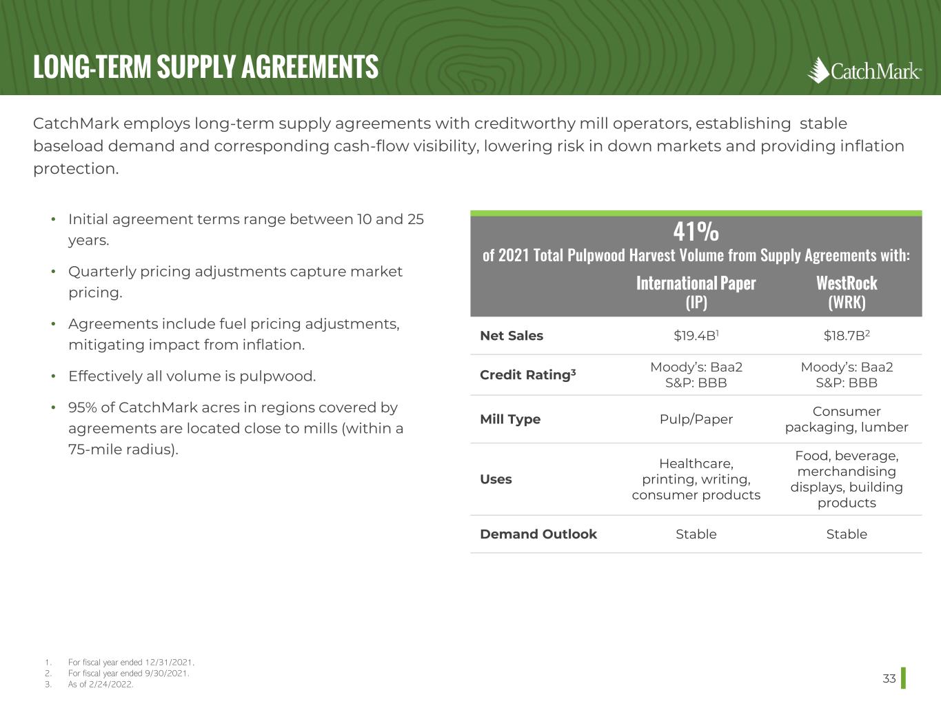 INDUSTRY LEADING CUSTOMERS/END USERS 32 Strong relationships and supply agreements with leading lumber producers and paper/packaging manufacturers help secure dependable outlets and pricing for CatchMark’s harvests. 1. For the year ended December 31, 2021. Canfor Top five lumber producer in North America. Georgia-Pacific Top 10 lumber producer in North America, #3 pulp/paper producer in the U.S. Interfor Top five lumber producer in North America. International Paper World’s largest pulp and paper company. M.C. Dixon Leading regional producer of SYP lumber. New-INDY Regional leader in lightweight linerboard production. West Fraser Top five lumber producer in North America. WestRock 2nd largest American packaging company. Relationships with the following companies account for 67% of CatchMark’s annual timber sales revenue1: