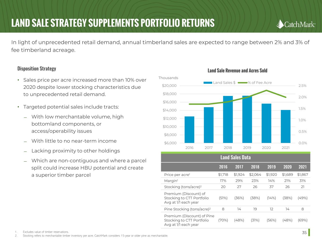 LAND SALE STRATEGY SUPPLEMENTS PORTFOLIO RETURNS 35 In light of unprecedented retail demand, annual timberland sales are expected to range between 2% and 3% of fee timberland acreage. 1. Excludes value of timber reservations. 2. Stocking refers to merchantable timber inventory per acre. CatchMark considers 15-year or older pine as merchantable. Disposition Strategy • Sales price per acre increased more than 10% over 2020 despite lower stocking characteristics due to unprecedented retail demand. • Targeted potential sales include tracts: ̶ With low merchantable volume, high bottomland components, or access/operability issues ̶ With little to no near-term income ̶ Lacking proximity to other holdings ̶ Which are non-contiguous and where a parcel split could increase HBU potential and create a superior timber parcel Land Sales Data 2016 2017 2018 2019 2020 2021 Price per acre1 $1,718 $1,924 $2,064 $1,920 $1,689 $1,867 Margin1 17% 29% 23% 14% 21% 31% Stocking (tons/acre)2 20 27 26 37 26 21 Premium (Discount) of Stocking to CTT Portfolio Avg at 1/1 each year (51%) (36%) (38%) (14%) (38%) (49%) Pine Stocking (tons/acre)2 8 14 19 12 14 8 Premium (Discount) of Pine Stocking to CTT Portfolio Avg at 1/1 each year (70%) (48%) (31%) (56%) (48%) (69%) 0.0% 0.5% 1.0% 1.5% 2.0% 2.5% $6,000 $8,000 $10,000 $12,000 $14,000 $16,000 $18,000 $20,000 2016 2017 2018 2019 2020 2021 Land Sales $ % of Fee Acre Land Sale Revenue and Acres Sold Thousands