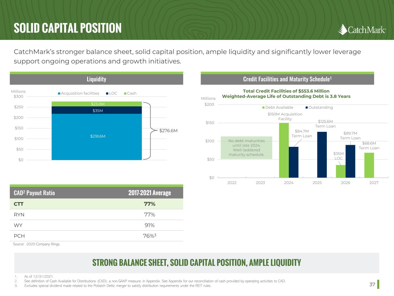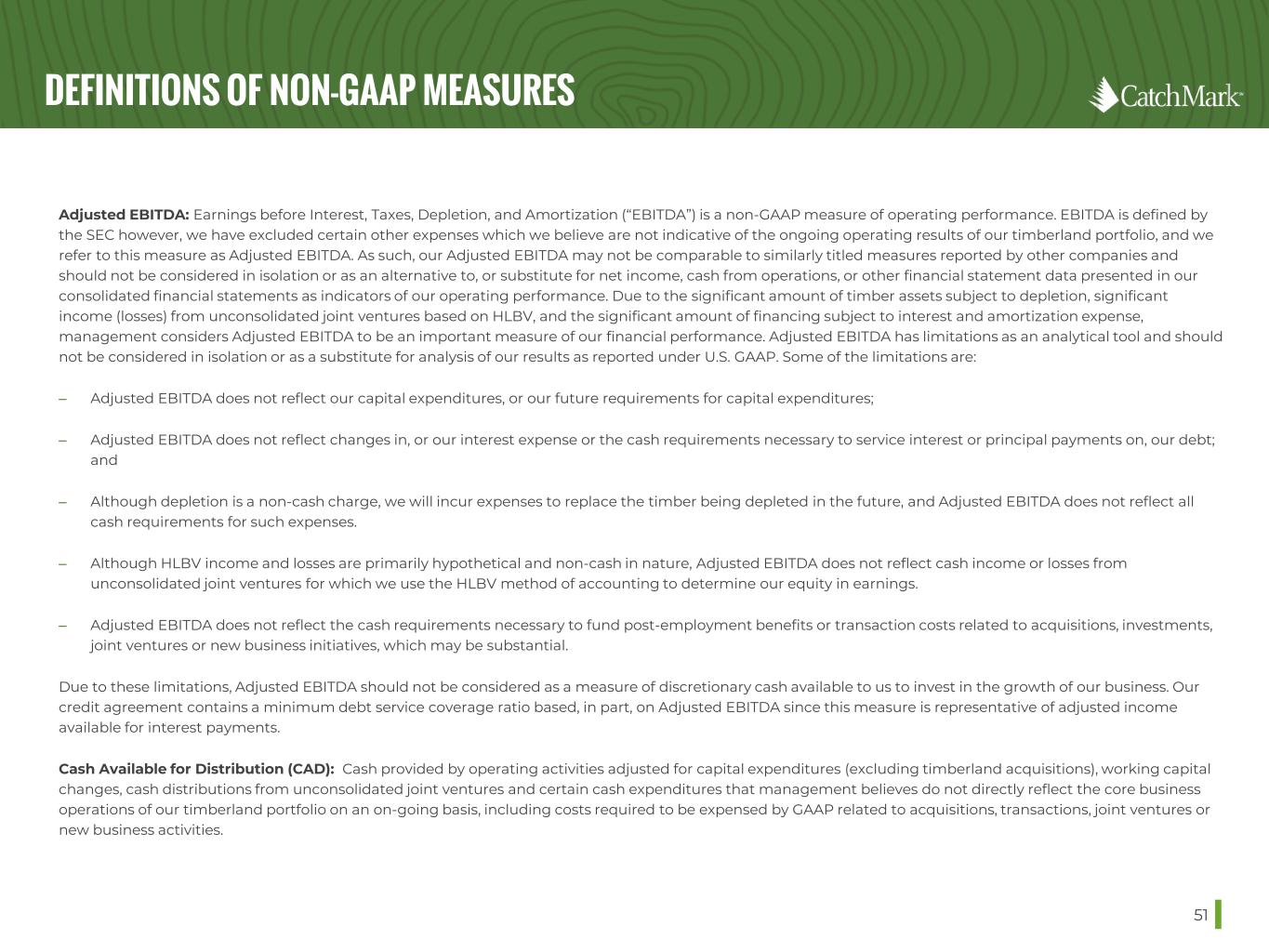 DEFINITIONS OF NON-GAAP MEASURES Adjusted EBITDA: Earnings before Interest, Taxes, Depletion, and Amortization (“EBITDA”) is a non-GAAP measure of operating performance. EBITDA is defined by the SEC however, we have excluded certain other expenses which we believe are not indicative of the ongoing operating results of our timberland portfolio, and we refer to this measure as Adjusted EBITDA. As such, our Adjusted EBITDA may not be comparable to similarly titled measures reported by other companies and should not be considered in isolation or as an alternative to, or substitute for net income, cash from operations, or other financial statement data presented in our consolidated financial statements as indicators of our operating performance. Due to the significant amount of timber assets subject to depletion, significant income (losses) from unconsolidated joint ventures based on HLBV, and the significant amount of financing subject to interest and amortization expense, management considers Adjusted EBITDA to be an important measure of our financial performance. Adjusted EBITDA has limitations as an analytical tool and should not be considered in isolation or as a substitute for analysis of our results as reported under U.S. GAAP. Some of the limitations are: ‒ Adjusted EBITDA does not reflect our capital expenditures, or our future requirements for capital expenditures; ‒ Adjusted EBITDA does not reflect changes in, or our interest expense or the cash requirements necessary to service interest or principal payments on, our debt; and ‒ Although depletion is a non-cash charge, we will incur expenses to replace the timber being depleted in the future, and Adjusted EBITDA does not reflect all cash requirements for such expenses. ‒ Although HLBV income and losses are primarily hypothetical and non-cash in nature, Adjusted EBITDA does not reflect cash income or losses from unconsolidated joint ventures for which we use the HLBV method of accounting to determine our equity in earnings. ‒ Adjusted EBITDA does not reflect the cash requirements necessary to fund post-employment benefits or transaction costs related to acquisitions, investments, joint ventures or new business initiatives, which may be substantial. Due to these limitations, Adjusted EBITDA should not be considered as a measure of discretionary cash available to us to invest in the growth of our business. Our credit agreement contains a minimum debt service coverage ratio based, in part, on Adjusted EBITDA since this measure is representative of adjusted income available for interest payments. Cash Available for Distribution (CAD): Cash provided by operating activities adjusted for capital expenditures (excluding timberland acquisitions), working capital changes, cash distributions from unconsolidated joint ventures and certain cash expenditures that management believes do not directly reflect the core business operations of our timberland portfolio on an on-going basis, including costs required to be expensed by GAAP related to acquisitions, transactions, joint ventures or new business activities. 51