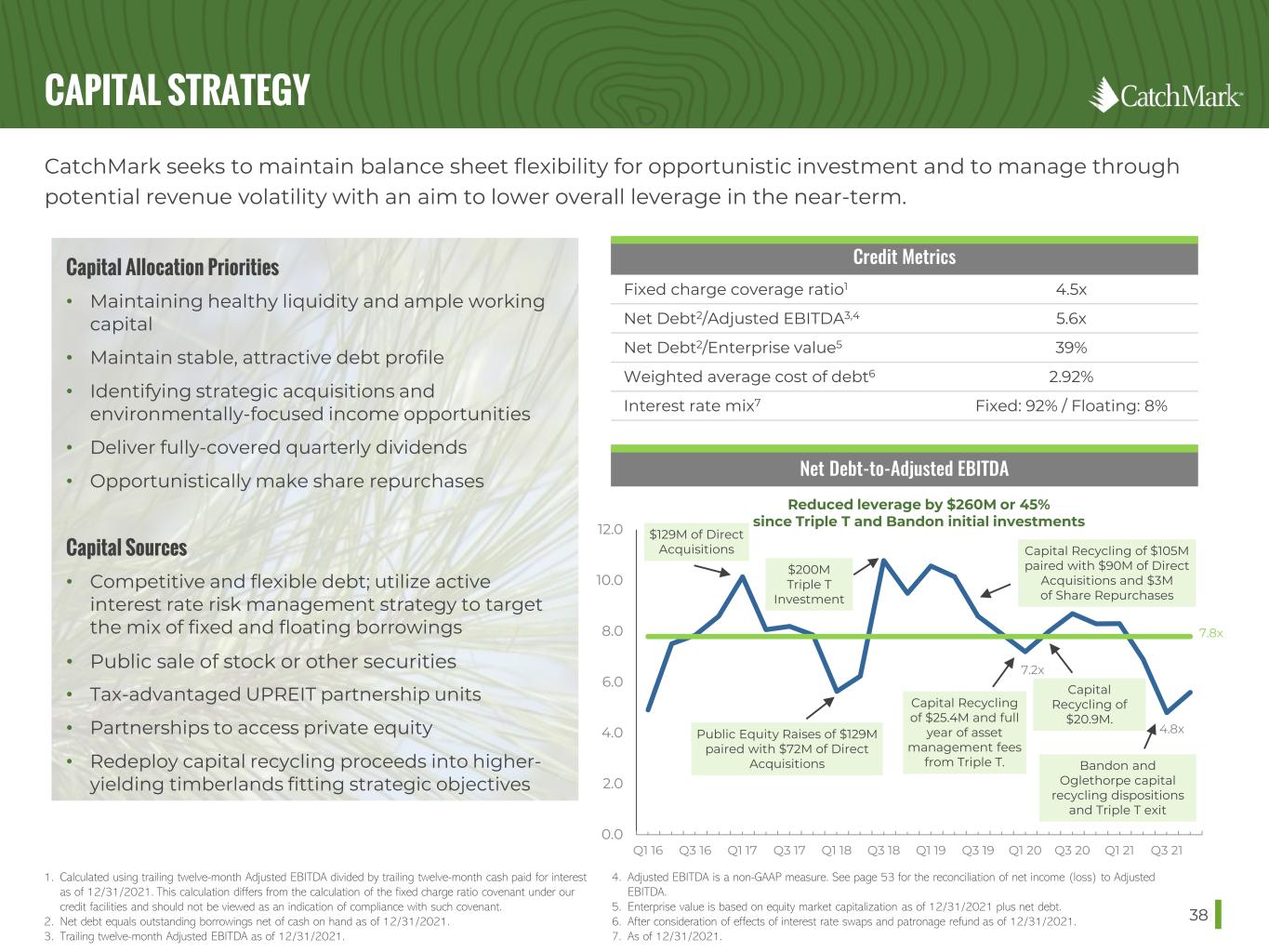 SOLID CAPITAL POSITION 37 CatchMark’s stronger balance sheet, solid capital position, ample liquidity and significantly lower leverage support ongoing operations and growth initiatives. Source: 2020 Company filings. 1. As of 12/31/2021. 2. See definition of Cash Available for Distributions (CAD), a non-GAAP measure, in Appendix. See Appendix for our reconciliation of cash provided by operating activities to CAD. 3. Excludes special dividend made related to the Potlatch Deltic merger to satisfy distribution requirements under the REIT rules. CAD2 Payout Ratio 2017-2021 Average CTT 77% RYN 77% WY 91% PCH 76%3 STRONG BALANCE SHEET, SOLID CAPITAL POSITION, AMPLE LIQUIDITY $0 $50 $100 $150 $200 $250 $300 Acquisition facilities LOC Cash $276.6M Millions Liquidity $218.6M $35M $23.0M Credit Facilities and Maturity Schedule1 Total Credit Facilities of $553.6 Million Weighted-Average Life of Outstanding Debt is 3.8 YearsMillions $150M Acquisition Facility $35M LOC $68.6M Term Loan $84.7M Term Loan $125.6M Term Loan $89.7M Term Loan $0 $50 $100 $150 $200 2022 2023 2024 2025 2026 2027 Debt Available Outstanding No debt maturities until late 2024. Well-laddered maturity schedule.
