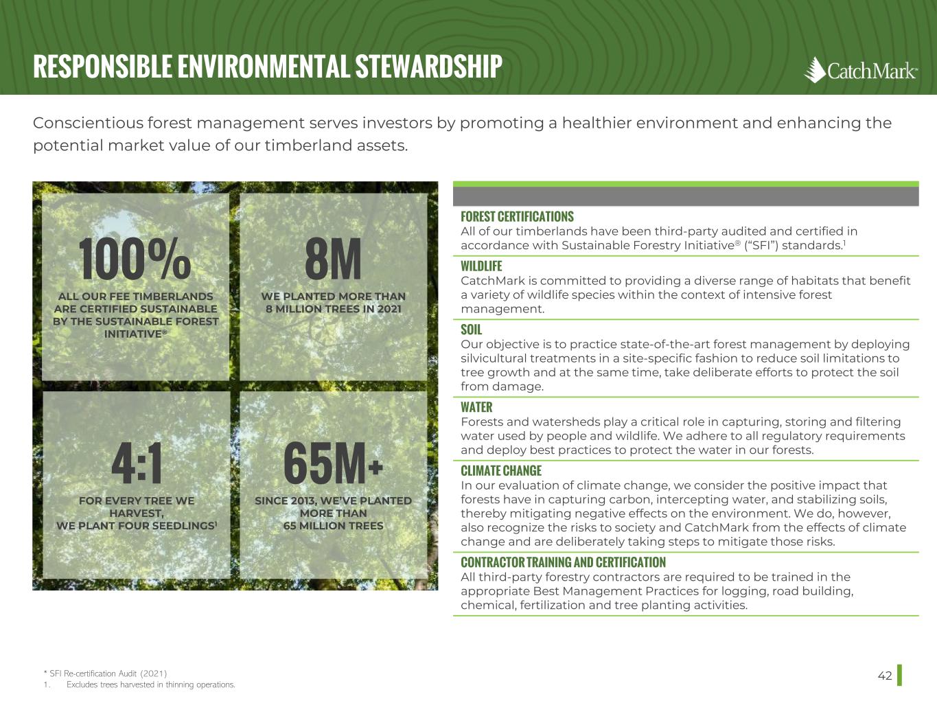 ESG AMBITIONS 41 • Continue to maintain 100% SFI (or other third party) certifications on all timberlands • Enhance processes to track, report and benchmark environmental data • Undertake climate change scenario analysis • Further evaluate other environmentally-friendly uses of our timberlands, i.e., carbon sequestration, wetlands mitigation banking, and solar projects • Expand environmental due diligence on all new acquisitions • Proactively engage with communities where we operate • Enhance contractor safety protocols and incident tracking • Encourage increased participation in charitable matching and employee volunteer programs • Enhance and formalize professional development opportunities for employees • Expand materiality assessment to include third-party input • Advance Enterprise Risk Assessment (ERA) system and reporting • Formalize training programs for employees and contractors with respect to our Code of Business Conduct and Ethics, ESG and Diversity and Inclusion • Recognize and commit to applicable UN Sustainable Development Goals • Expand ongoing framework and guidelines for ESG reporting GOVERNANCE ENVIRONMENTAL SOCIAL