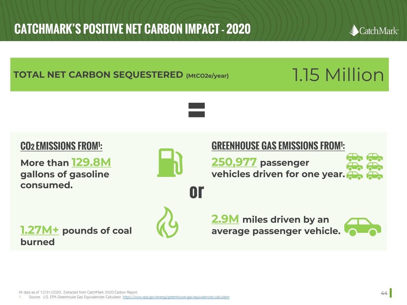 CATCHMARK’S POSITIVE NET CARBON IMPACT - 2020 44 TOTAL NET CARBON SEQUESTERED (MtCO2e/year) 1.15 Million GREENHOUSE GAS EMISSIONS FROM1: 250,977 passenger vehicles driven for one year. 2.9M miles driven by an average passenger vehicle. CO2 EMISSIONS FROM1: More than 129.8M gallons of gasoline consumed. 1.27M+ pounds of coal burned = or All data as of 12/31/2020. Extracted from CatchMark 2020 Carbon Report. 1. Source: U.S. EPA Greenhouse Gas Equivalencies Calculator. https://www.epa.gov/energy/greenhouse-gas-equivalencies-calculator
