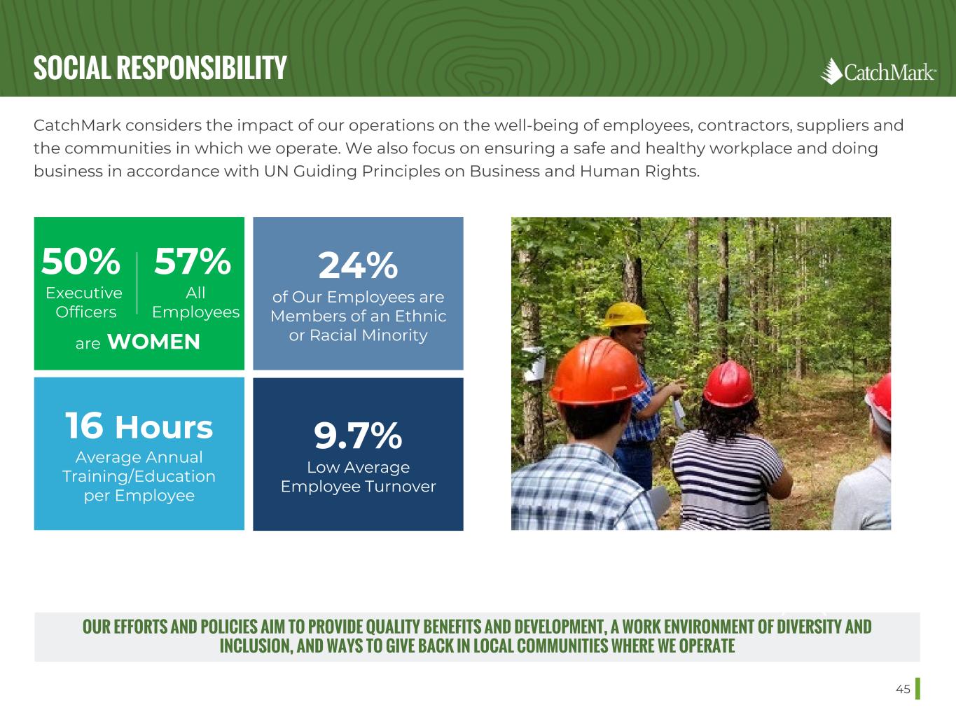 SOCIAL RESPONSIBILITY 45 CatchMark considers the impact of our operations on the well-being of employees, contractors, suppliers and the communities in which we operate. We also focus on ensuring a safe and healthy workplace and doing business in accordance with UN Guiding Principles on Business and Human Rights. 24% of Our Employees are Members of an Ethnic or Racial Minority 16 Hours Average Annual Training/Education per Employee 9.7% Low Average Employee Turnover OUR EFFORTS AND POLICIES AIM TO PROVIDE QUALITY BENEFITS AND DEVELOPMENT, A WORK ENVIRONMENT OF DIVERSITY AND INCLUSION, AND WAYS TO GIVE BACK IN LOCAL COMMUNITIES WHERE WE OPERATE 50% Executive Officers 57% All Employees are WOMEN