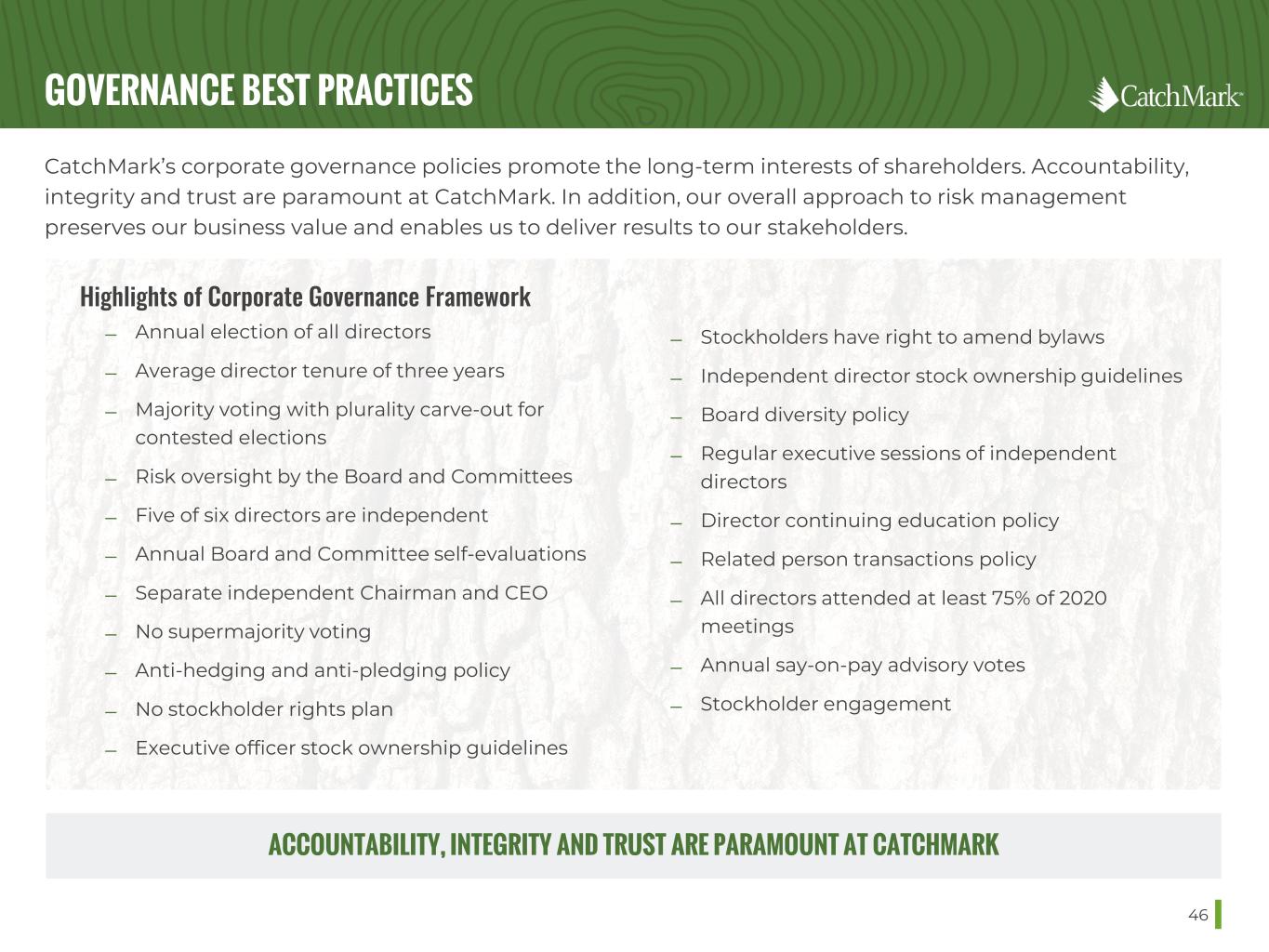 GOVERNANCE BEST PRACTICES 46 CatchMark’s corporate governance policies promote the long-term interests of shareholders. Accountability, integrity and trust are paramount at CatchMark. In addition, our overall approach to risk management preserves our business value and enables us to deliver results to our stakeholders. ACCOUNTABILITY, INTEGRITY AND TRUST ARE PARAMOUNT AT CATCHMARK Highlights of Corporate Governance Framework ̶ Annual election of all directors ̶ Average director tenure of three years ̶ Majority voting with plurality carve-out for contested elections ̶ Risk oversight by the Board and Committees ̶ Five of six directors are independent ̶ Annual Board and Committee self-evaluations ̶ Separate independent Chairman and CEO ̶ No supermajority voting ̶ Anti-hedging and anti-pledging policy ̶ No stockholder rights plan ̶ Executive officer stock ownership guidelines ̶ Stockholders have right to amend bylaws ̶ Independent director stock ownership guidelines ̶ Board diversity policy ̶ Regular executive sessions of independent directors ̶ Director continuing education policy ̶ Related person transactions policy ̶ All directors attended at least 75% of 2020 meetings ̶ Annual say-on-pay advisory votes ̶ Stockholder engagement