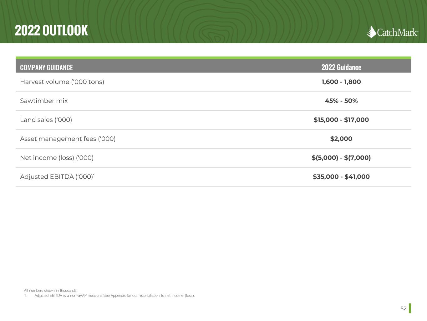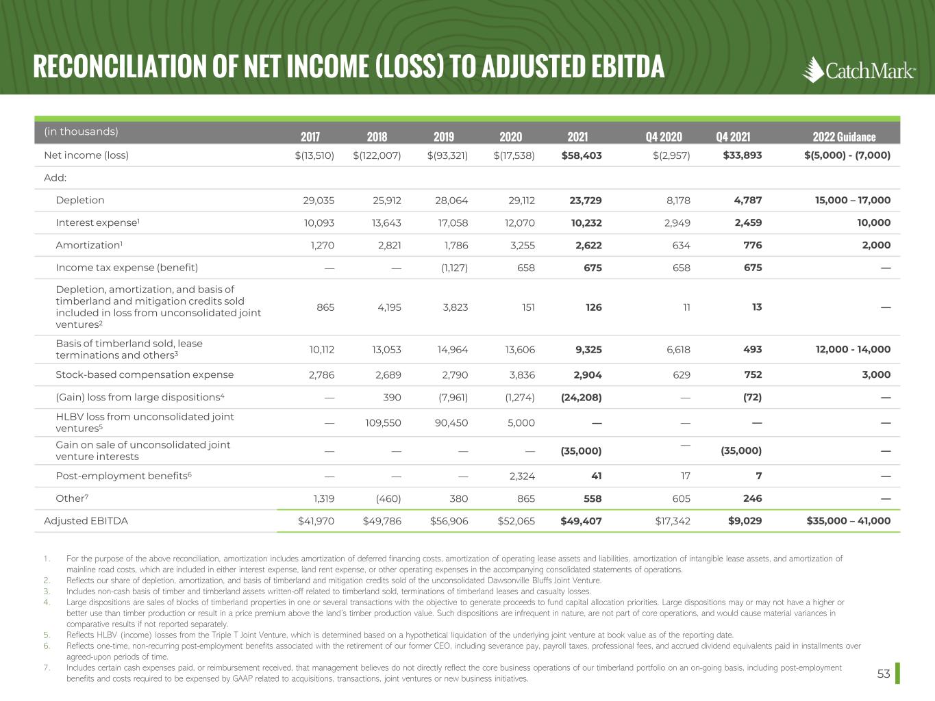 RECONCILIATION OF NET INCOME (LOSS) TO ADJUSTED EBITDA 53 1. For the purpose of the above reconciliation, amortization includes amortization of deferred financing costs, amortization of operating lease assets and liabilities, amortization of intangible lease assets, and amortization of mainline road costs, which are included in either interest expense, land rent expense, or other operating expenses in the accompanying consolidated statements of operations. 2. Reflects our share of depletion, amortization, and basis of timberland and mitigation credits sold of the unconsolidated Dawsonville Bluffs Joint Venture. 3. Includes non-cash basis of timber and timberland assets written-off related to timberland sold, terminations of timberland leases and casualty losses. 4. Large dispositions are sales of blocks of timberland properties in one or several transactions with the objective to generate proceeds to fund capital allocation priorities. Large dispositions may or may not have a higher or better use than timber production or result in a price premium above the land’s timber production value. Such dispositions are infrequent in nature, are not part of core operations, and would cause material variances in comparative results if not reported separately. 5. Reflects HLBV (income) losses from the Triple T Joint Venture, which is determined based on a hypothetical liquidation of the underlying joint venture at book value as of the reporting date. 6. Reflects one-time, non-recurring post-employment benefits associated with the retirement of our former CEO, including severance pay, payroll taxes, professional fees, and accrued dividend equivalents paid in installments over agreed-upon periods of time. 7. Includes certain cash expenses paid, or reimbursement received, that management believes do not directly reflect the core business operations of our timberland portfolio on an on-going basis, including post-employment benefits and costs required to be expensed by GAAP related to acquisitions, transactions, joint ventures or new business initiatives. (in thousands) 2017 2018 2019 2020 2021 Q4 2020 Q4 2021 2022 Guidance Net income (loss) $(13,510) $(122,007) $(93,321) $(17,538) $58,403 $(2,957) $33,893 $(5,000) - (7,000) Add: Depletion 29,035 25,912 28,064 29,112 23,729 8,178 4,787 15,000 – 17,000 Interest expense1 10,093 13,643 17,058 12,070 10,232 2,949 2,459 10,000 Amortization1 1,270 2,821 1,786 3,255 2,622 634 776 2,000 Income tax expense (benefit) — — (1,127) 658 675 658 675 — Depletion, amortization, and basis of timberland and mitigation credits sold included in loss from unconsolidated joint ventures2 865 4,195 3,823 151 126 11 13 — Basis of timberland sold, lease terminations and others3 10,112 13,053 14,964 13,606 9,325 6,618 493 12,000 - 14,000 Stock-based compensation expense 2,786 2,689 2,790 3,836 2,904 629 752 3,000 (Gain) loss from large dispositions4 — 390 (7,961) (1,274) (24,208) — (72) — HLBV loss from unconsolidated joint ventures5 — 109,550 90,450 5,000 — — — — Gain on sale of unconsolidated joint venture interests — — — — (35,000) — (35,000) — Post-employment benefits6 — — — 2,324 41 17 7 — Other7 1,319 (460) 380 865 558 605 246 — Adjusted EBITDA $41,970 $49,786 $56,906 $52,065 $49,407 $17,342 $9,029 $35,000 – 41,000