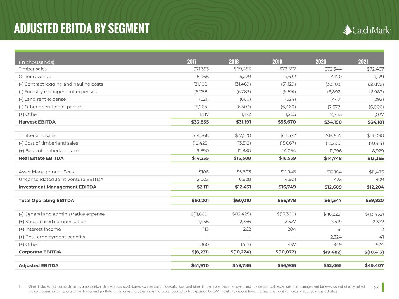 ADJUSTED EBITDA BY SEGMENT 541. Other includes (a) non-cash items: amortization, depreciation, stock-based compensation, casualty loss, and other timber asset basis removed; and (b) certain cash expenses that management believes do not directly reflect the core business operations of our timberland portfolio on an on-going basis, including costs required to be expensed by GAAP related to acquisitions, transactions, joint ventures or new business activities. (in thousands) 2017 2018 2019 2020 2021 Timber sales $71,353 $69,455 $72,557 $72,344 $72,467 Other revenue 5,066 5,279 4,632 4,120 4,129 (-) Contract logging and hauling costs (31,108) (31,469) (31,129) (30,103) (30,172) (-) Forestry management expenses (6,758) (6,283) (6,691) (6,892) (6,982) (-) Land rent expense (621) (660) (524) (447) (292) (-) Other operating expenses (5,264) (6,303) (6,460) (7,577) (6,006) (+) Other1 1,187 1,172 1,285 2,745 1,037 Harvest EBITDA $33,855 $31,191 $33,670 $34,190 $34,181 Timberland sales $14,768 $17,520 $17,572 $15,642 $14,090 (-) Cost of timberland sales (10,423) (13,512) (15,067) (12,290) (9,664) (+) Basis of timberland sold 9,890 12,380 14,054 11,396 8,929 Real Estate EBITDA $14,235 $16,388 $16,559 $14,748 $13,355 Asset Management Fees $108 $5,603 $11,948 $12,184 $11,475 Unconsolidated Joint Venture EBITDA 2,003 6,828 4,801 425 809 Investment Management EBITDA $2,111 $12,431 $16,749 $12,609 $12,284 Total Operating EBITDA $50,201 $60,010 $66,978 $61,547 $59,820 (-) General and administrative expense $(11,660) $(12,425) $(13,300) $(16,225) $(13,452) (+) Stock-based compensation 1,956 2,356 2,527 3,419 2,372 (+) Interest Income 113 262 204 51 2 (+) Post-employment benefits - - - 2,324 41 (+) Other1 1,360 (417) 497 949 624 Corporate EBITDA $(8,231) $(10,224) $(10,072) $(9,482) $(10,413) Adjusted EBITDA $41,970 $49,786 $56,906 $52,065 $49,407