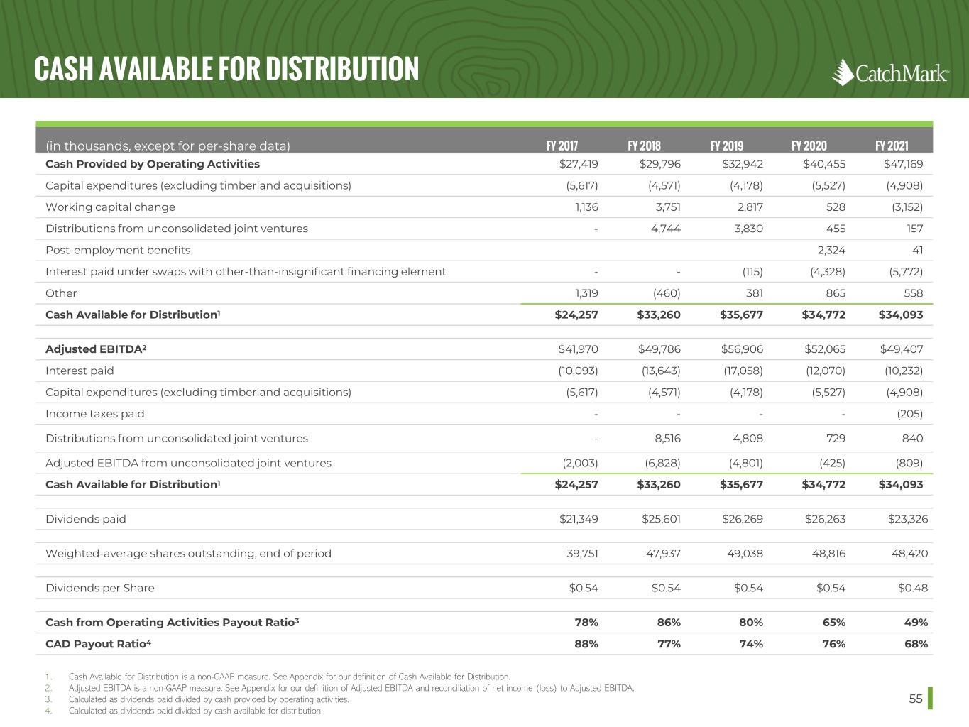 CASH AVAILABLE FOR DISTRIBUTION 55 1. Cash Available for Distribution is a non-GAAP measure. See Appendix for our definition of Cash Available for Distribution. 2. Adjusted EBITDA is a non-GAAP measure. See Appendix for our definition of Adjusted EBITDA and reconciliation of net income (loss) to Adjusted EBITDA. 3. Calculated as dividends paid divided by cash provided by operating activities. 4. Calculated as dividends paid divided by cash available for distribution. (in thousands, except for per-share data) FY 2017 FY 2018 FY 2019 FY 2020 FY 2021 Cash Provided by Operating Activities $27,419 $29,796 $32,942 $40,455 $47,169 Capital expenditures (excluding timberland acquisitions) (5,617) (4,571) (4,178) (5,527) (4,908) Working capital change 1,136 3,751 2,817 528 (3,152) Distributions from unconsolidated joint ventures - 4,744 3,830 455 157 Post-employment benefits 2,324 41 Interest paid under swaps with other-than-insignificant financing element - - (115) (4,328) (5,772) Other 1,319 (460) 381 865 558 Cash Available for Distribution1 $24,257 $33,260 $35,677 $34,772 $34,093 Adjusted EBITDA2 $41,970 $49,786 $56,906 $52,065 $49,407 Interest paid (10,093) (13,643) (17,058) (12,070) (10,232) Capital expenditures (excluding timberland acquisitions) (5,617) (4,571) (4,178) (5,527) (4,908) Income taxes paid - - - - (205) Distributions from unconsolidated joint ventures - 8,516 4,808 729 840 Adjusted EBITDA from unconsolidated joint ventures (2,003) (6,828) (4,801) (425) (809) Cash Available for Distribution1 $24,257 $33,260 $35,677 $34,772 $34,093 Dividends paid $21,349 $25,601 $26,269 $26,263 $23,326 Weighted-average shares outstanding, end of period 39,751 47,937 49,038 48,816 48,420 Dividends per Share $0.54 $0.54 $0.54 $0.54 $0.48 Cash from Operating Activities Payout Ratio3 78% 86% 80% 65% 49% CAD Payout Ratio4 88% 77% 74% 76% 68%