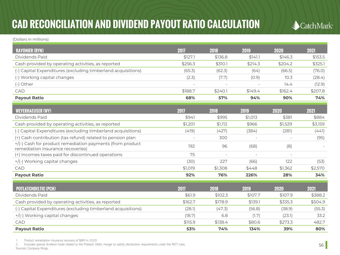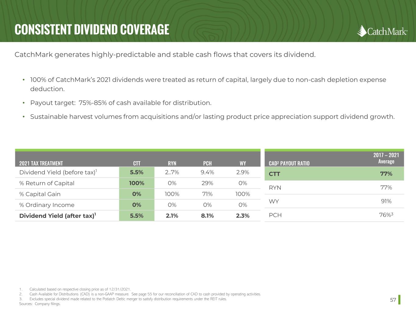 CAD RECONCILIATION AND DIVIDEND PAYOUT RATIO CALCULATION 56 RAYONIER (RYN) 2017 2018 2019 2020 2021 Dividends Paid $127.1 $136.8 $141.1 $146.3 $153.5 Cash provided by operating activities, as reported $256.3 $310.1 $214.3 $204.2 $325.1 (-) Capital Expenditures (excluding timberland acquisitions) (65.3) (62.3) (64) (66.5) (76.0) (-) Working capital changes (2.3) (7.7) (0.9) 10.3 (28.4) (-) Other - - - 14.4 (12.9) CAD $188.7 $240.1 $149.4 $162.4 $207.8 Payout Ratio 68% 57% 94% 90% 74% (Dollars in millions) WEYERHAEUSER (WY) 2017 2018 2019 2020 2021 Dividends Paid $941 $995 $1,013 $381 $884 Cash provided by operating activities, as reported $1,201 $1,112 $966 $1,529 $3,159 (-) Capital Expenditures (excluding timberland acquisitions) (419) (427) (384) (281) (441) (+) Cash contribution (tax refund) related to pension plan - 300 - - (95) +/(-) Cash for product remediation payments (from product remediation insurance recoveries) 192 96 (68) (8) - (+) Incomes taxes paid for discontinued operations 75 - - - +/(-) Working capital changes (30) 227 (66) 122 (53) CAD $1,019 $1,308 $448 $1,362 $2,570 Payout Ratio 92% 76% 226% 28% 34% POTLATCHDELTIC (PCH) 2017 2018 2019 2020 2021 Dividends Paid $61.9 $102.3 $107.7 $107.9 $388.2 Cash provided by operating activities, as reported $162.7 $178.9 $139.1 $335.3 $504.9 (-) Capital Expenditures (excluding timberland acquisitions) (28.1) (47.3) (56.8) (38.9) (55.3) +/(-) Working capital changes (18.7) 6.8 (1.7) (23.1) 33.2 CAD $115.9 $138.4 $80.6 $273.3 482.7 Payout Ratio 53% 74% 134% 39% 80% 1. Product remediation insurance recovery of $8M in 2020 2. Excludes special dividend made related to the Potlatch Deltic merger to satisfy distribution requirements under the REIT rules. Sources: Company filings.