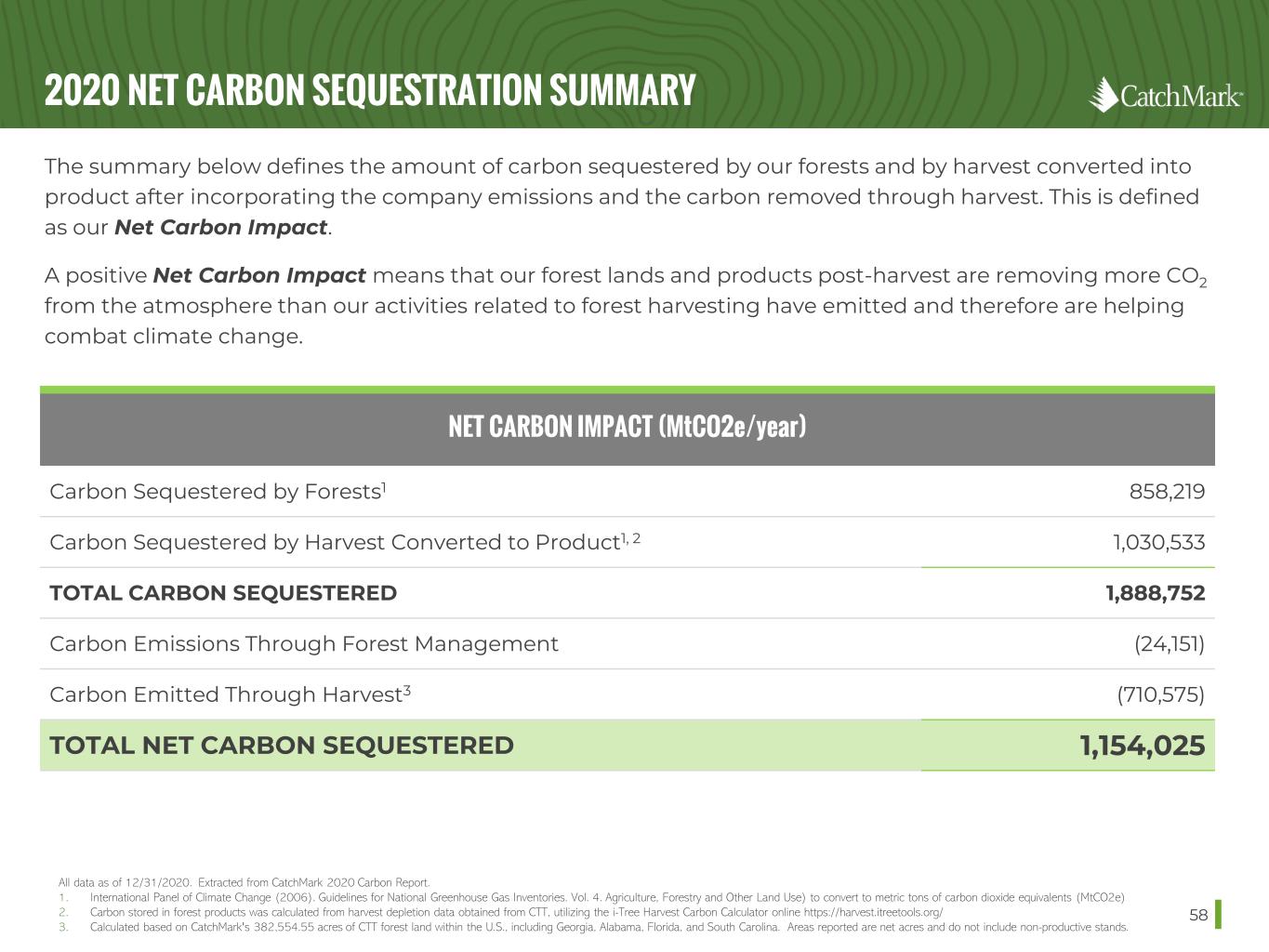 2020 NET CARBON SEQUESTRATION SUMMARY 58 The summary below defines the amount of carbon sequestered by our forests and by harvest converted into product after incorporating the company emissions and the carbon removed through harvest. This is defined as our Net Carbon Impact. A positive Net Carbon Impact means that our forest lands and products post-harvest are removing more CO2 from the atmosphere than our activities related to forest harvesting have emitted and therefore are helping combat climate change. NET CARBON IMPACT (MtCO2e/year) Carbon Sequestered by Forests1 858,219 Carbon Sequestered by Harvest Converted to Product1, 2 1,030,533 TOTAL CARBON SEQUESTERED 1,888,752 Carbon Emissions Through Forest Management (24,151) Carbon Emitted Through Harvest3 (710,575) TOTAL NET CARBON SEQUESTERED 1,154,025 All data as of 12/31/2020. Extracted from CatchMark 2020 Carbon Report. 1. International Panel of Climate Change (2006). Guidelines for National Greenhouse Gas Inventories. Vol. 4. Agriculture, Forestry and Other Land Use) to convert to metric tons of carbon dioxide equivalents (MtCO2e) 2. Carbon stored in forest products was calculated from harvest depletion data obtained from CTT, utilizing the i-Tree Harvest Carbon Calculator online https://harvest.itreetools.org/ 3. Calculated based on CatchMark's 382,554.55 acres of CTT forest land within the U.S., including Georgia, Alabama, Florida, and South Carolina. Areas reported are net acres and do not include non-productive stands.