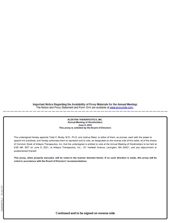 Important Notice Regarding the Availability of Proxy Materials for the Annual Meeting: The Notice and Proxy Statement and Form 10-K are available at www.proxyvote.com . ALDEYRA THERAPEUTICS, INC. Annual Meeting of Stockholders June 8, 2021 This proxy is solicited by the Board of Directors The undersigned hereby appoints Todd C. Brady, M.D., Ph.D. and Joshua Reed, or either of them, as proxies, each with the power to appoint his substitute, and hereby authorizes them to represent and to vote, as designated on the reverse side of this ballot, all of the shares of Common Stock of Aldeyra Therapeutics, Inc. that the undersigned is entitled to vote at the Annual Meeting of Stockholders to be held at 8:00 AM, EDT on June 8, 2021, at Aldeyra Therapeutics, Inc., 131 Hartwell Avenue, Lexington, MA 02421, and any adjournment or postponement thereof. This proxy, when properly executed, will be voted in the manner directed herein. If no such direction is made, this proxy will be voted in accordance with the Board of Directors' recommendations. Continued and to be signed on reverse side 0000508776_2 R1.0.0.177
