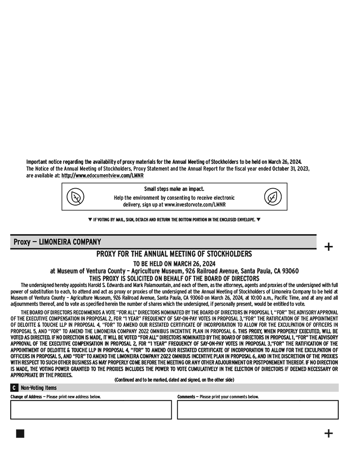 These matters are more fully described in the enclosed proxy statement. The Board of Directors recommends that you vote FOR ALL the director nominees, FOR the advisory approval of the compensation of the Named Executive Officers, for every ONE year as to the frequency of Say-on-Pay votes, FOR the ratification of the independent auditors, FOR the amendment of our Restated Certificate of Incorporation, and FOR the amendment to the Limoneira Company 2022 Omnibus Incentive Plan.