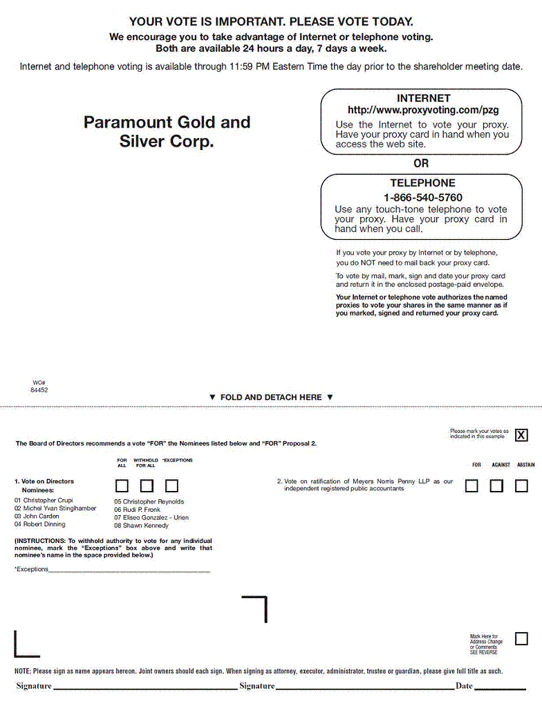 If you have questions about the Meeting after reading this proxy, or if you would like additional copies of this proxy statement or the proxy card, you should contact Paramount Gold and Silver Corp., 665 Anderson Street, Winnemucca, Nevada, 89445 telephone (775)625-3600, Attn: Christopher Crupi.