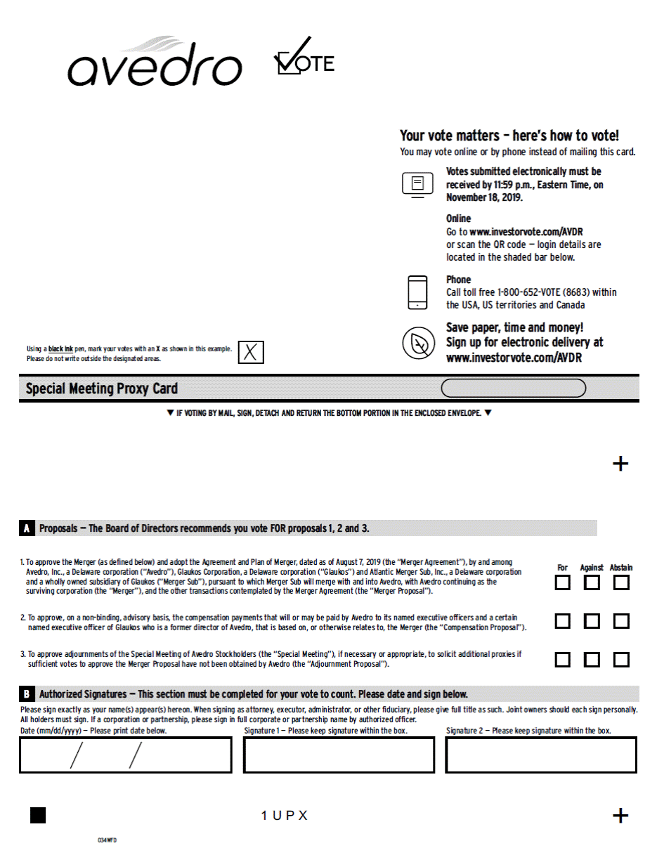 Your vote matters – here’s how to vote! You may vote online or by phone instead of mailing this card. Votes submitted electronically must be received by 11:59 p.m., Eastern Time, on November 18, 2019. Online Go to www.investorvote.com/AVDR or scan the QR code — login details are located in the shaded bar below. Phone Call toll free 1-800-652-VOTE (8683) within the USA, US territories and Canada Save paper, time and money! Sign up for electronic delivery at www.investorvote.com/AVDR Using a black ink pen, mark your votes with an X as shown in this example. Please do not write outside the designated areas. q IF VOTING BY MAIL, SIGN, DETACH AND RETURN THE BOTTOM PORTION IN THE ENCLOSED ENVELOPE. q + 1. To approve the Merger (as defined below) and adopt the Agreement and Plan of Merger, dated as of August 7, 2019 (the “Merger Agreement”), by and among Avedro, Inc., a Delaware corporation (“Avedro”), Glaukos Corporation, a Delaware corporation (“Glaukos”) and Atlantic Merger Sub, Inc., a Delaware corporation and a wholly owned subsidiary of Glaukos (“Merger Sub”), pursuant to which Merger Sub will merge with and into Avedro, with Avedro continuing as the surviving corporation (the “Merger”), and the other transactions contemplated by the Merger Agreement (the “Merger Proposal”). ForAgainst Abstain 2. To approve, on a non-binding, advisory basis, the compensation payments that will or may be paid by Avedro to its named executive officers and a certain named executive officer of Glaukos who is a former director of Avedro, that is based on, or otherwise relates to, the Merger (the “Compensation Proposal”). 3. To approve adjournments of the Special Meeting of Avedro Stockholders (the “Special Meeting”), if necessary or appropriate, to solicit additional proxies if sufficient votes to approve the Merger Proposal have not been obtained by Avedro (the “Adjournment Proposal”). Please sign exactly as your name(s) appear(s) hereon. When signing as attorney, executor, administrator, or other fiduciary, please give full title as such. Joint owners should each sign personally. All holders must sign. If a corporation or partnership, please sign in full corporate or partnership name by authorized officer. Date (mm/dd/yyyy) — Please print date below. Signature 1 — Please keep signature within the box. Signature 2 — Please keep signature within the box. + 1 U P X 034WFD B Authorized Signatures — This section must be completed for your vote to count. Please date and sign below. A Proposals — The Board of Directors recommends you vote FOR proposals 1, 2 and 3. Special Meeting Proxy Card