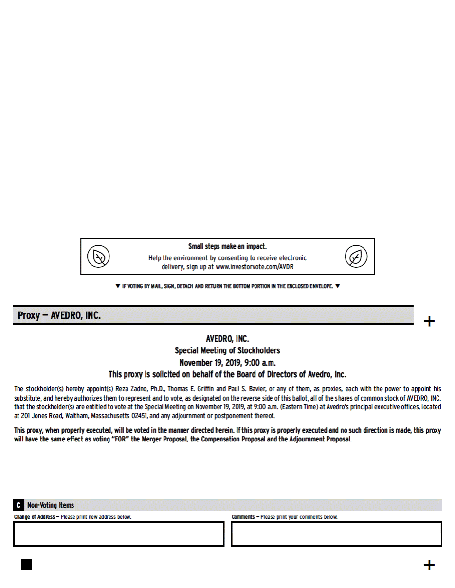 q IF VOTING BY MAIL, SIGN, DETACH AND RETURN THE BOTTOM PORTION IN THE ENCLOSED ENVELOPE. q + AVEDRO, INC. Special Meeting of Stockholders November 19, 2019, 9:00 a.m. This proxy is solicited on behalf of the Board of Directors of Avedro, Inc. The stockholder(s) hereby appoint(s) Reza Zadno, Ph.D., Thomas E. Griffin and Paul S. Bavier, or any of them, as proxies, each with the power to appoint his substitute, and hereby authorizes them to represent and to vote, as designated on the reverse side of this ballot, all of the shares of common stock of AVEDRO, INC. that the stockholder(s) are entitled to vote at the Special Meeting on November 19, 2019, at 9:00 a.m. (Eastern Time) at Avedro’s principal executive offices, located at 201 Jones Road, Waltham, Massachusetts 02451, and any adjournment or postponement thereof. This proxy, when properly executed, will be voted in the manner directed herein. If this proxy is properly executed and no such direction is made, this proxy will have the same effect as voting “FOR” the Merger Proposal, the Compensation Proposal and the Adjournment Proposal. Change of Address — Please print new address below. Comments — Please print your comments below. + C Non-Voting Items Proxy — AVEDRO, INC. Small steps make an impact. Help the environment by consenting to receive electronic delivery, sign up at www.investorvote.com/AVDR