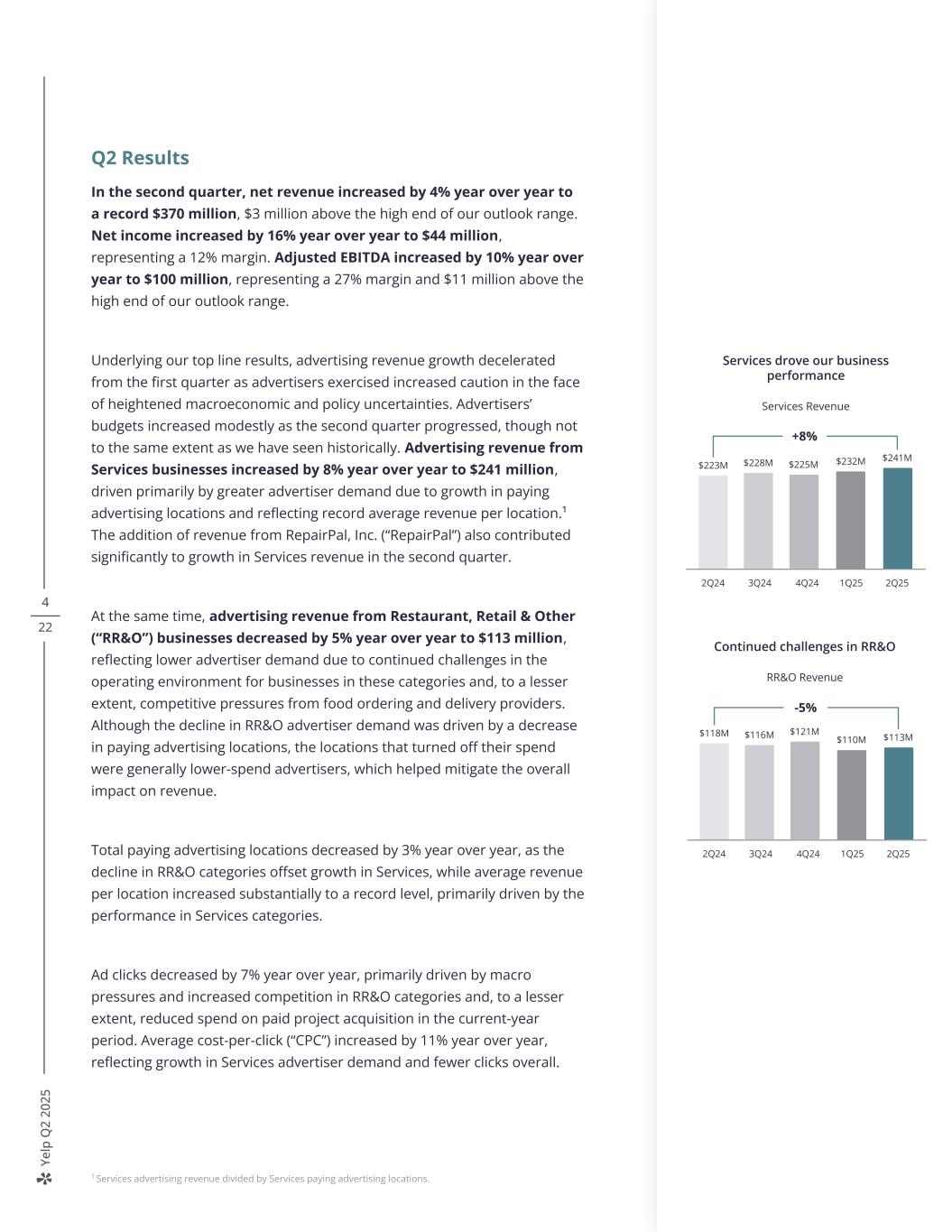 Ye lp Q 2 20 25 4 22 Q2 Results In the second quarter, net revenue increased by 4% year over year to a record $370 million, $3 million above the high end of our outlook range. Net income increased by 16% year over year to $44 million, representing a 12% margin. Adjusted EBITDA increased by 10% year over year to $100 million, representing a 27% margin and $11 million above the high end of our outlook range. Underlying our top line results, advertising revenue growth decelerated from the first quarter as advertisers exercised increased caution in the face of heightened macroeconomic and policy uncertainties. Advertisers’ budgets increased modestly as the second quarter progressed, though not to the same extent as we have seen historically. Advertising revenue from Services businesses increased by 8% year over year to $241 million, driven primarily by greater advertiser demand due to growth in paying advertising locations and reflecting record average revenue per location.¹ The addition of revenue from RepairPal, Inc. (“RepairPal”) also contributed significantly to growth in Services revenue in the second quarter. At the same time, advertising revenue from Restaurant, Retail & Other (“RR&O”) businesses decreased by 5% year over year to $113 million, reflecting lower advertiser demand due to continued challenges in the operating environment for businesses in these categories and, to a lesser extent, competitive pressures from food ordering and delivery providers. Although the decline in RR&O advertiser demand was driven by a decrease in paying advertising locations, the locations that turned off their spend were generally lower-spend advertisers, which helped mitigate the overall impact on revenue. Total paying advertising locations decreased by 3% year over year, as the decline in RR&O categories offset growth in Services, while average revenue per location increased substantially to a record level, primarily driven by the performance in Services categories. Ad clicks decreased by 7% year over year, primarily driven by macro pressures and increased competition in RR&O categories and, to a lesser extent, reduced spend on paid project acquisition in the current-year period. Average cost-per-click (“CPC”) increased by 11% year over year, reflecting growth in Services advertiser demand and fewer clicks overall. 1 Services advertising revenue divided by Services paying advertising locations. Services drove our business performance Services Revenue +8% $223M 2Q24 3Q24 4Q24 1Q25 2Q25 $241M$228M $225M $232M Continued challenges in RR&O RR&O Revenue -5% $118M 2Q24 3Q24 4Q24 1Q25 2Q25 $113M$116M $121M $110M