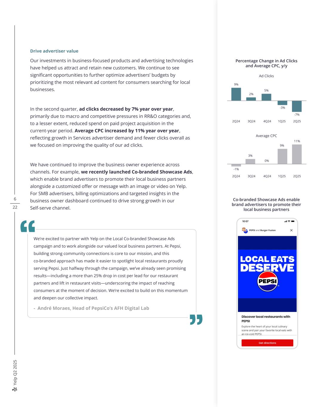 Ye lp Q 2 20 25 6 22 Drive advertiser value Our investments in business-focused products and advertising technologies have helped us attract and retain new customers. We continue to see significant opportunities to further optimize advertisers’ budgets by prioritizing the most relevant ad content for consumers searching for local businesses. In the second quarter, ad clicks decreased by 7% year over year, primarily due to macro and competitive pressures in RR&O categories and, to a lesser extent, reduced spend on paid project acquisition in the current-year period. Average CPC increased by 11% year over year, reflecting growth in Services advertiser demand and fewer clicks overall as we focused on improving the quality of our ad clicks. We have continued to improve the business owner experience across channels. For example, we recently launched Co-branded Showcase Ads, which enable brand advertisers to promote their local business partners alongside a customized offer or message with an image or video on Yelp. For SMB advertisers, billing optimizations and targeted insights in the business owner dashboard continued to drive strong growth in our Self-serve channel. AI-powered call answering services to help business owners stay connected Percentage Change in Ad Clicks and Average CPC, y/y Ad Clicks 9% 2Q24 3Q24 1Q25 2Q25 -7% 2% 5% -3% 4Q24 0% Average CPC -1% 2Q24 3Q24 4Q24 1Q25 2Q25 3% 11% 9% Co-branded Showcase Ads enable brand advertisers to promote their local business partners We’re excited to partner with Yelp on the Local Co-branded Showcase Ads campaign and to work alongside our valued local business partners. At Pepsi, building strong community connections is core to our mission, and this co-branded approach has made it easier to spotlight local restaurants proudly serving Pepsi. Just halfway through the campaign, we’ve already seen promising results—including a more than 25% drop in cost per lead for our restaurant partners and lift in restaurant visits—underscoring the impact of reaching consumers at the moment of decision. We’re excited to build on this momentum and deepen our collective impact. - André Moraes, Head of PepsiCo’s AFH Digital Lab