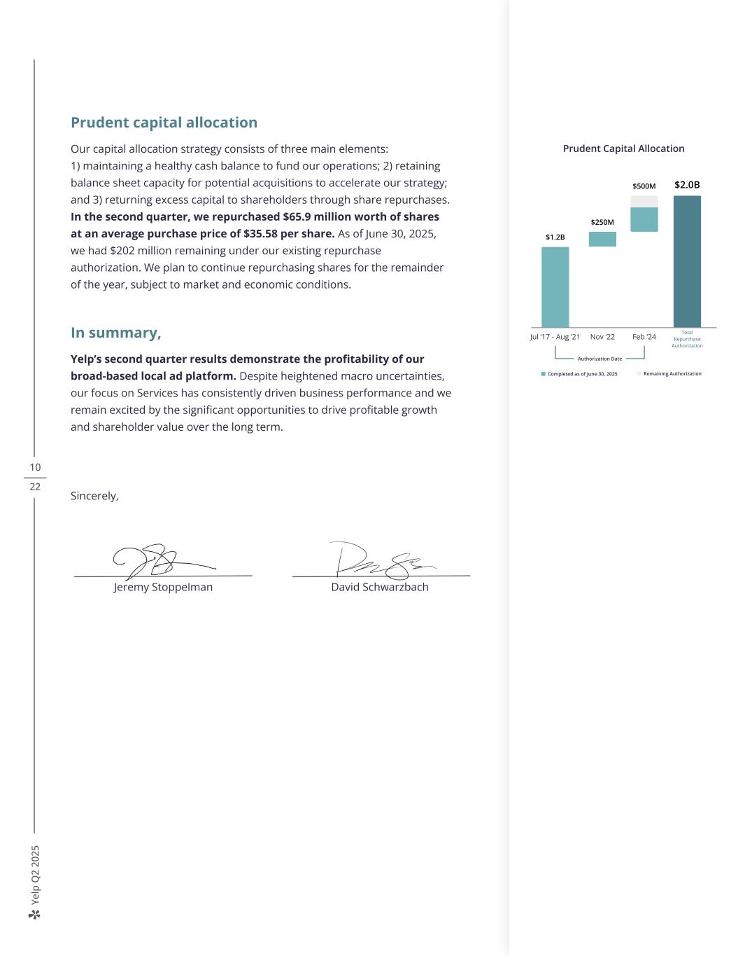 Ye lp Q 2 20 25 10 22 Prudent capital allocation Our capital allocation strategy consists of three main elements: 1) maintaining a healthy cash balance to fund our operations; 2) retaining balance sheet capacity for potential acquisitions to accelerate our strategy; and 3) returning excess capital to shareholders through share repurchases. In the second quarter, we repurchased $65.9 million worth of shares at an average purchase price of $35.58 per share. As of June 30, 2025, we had $202 million remaining under our existing repurchase authorization. We plan to continue repurchasing shares for the remainder of the year, subject to market and economic conditions. In summary, Yelp’s second quarter results demonstrate the profitability of our broad-based local ad platform. Despite heightened macro uncertainties, our focus on Services has consistently driven business performance and we remain excited by the significant opportunities to drive profitable growth and shareholder value over the long term. Sincerely, Total Repurchase Authorization Authorization Date Prudent Capital Allocation $2.0B Completed as of June 30, 2024 Remaining Authorization $200M $250M $250M $250M $250M $250M Nov ‘22Jul ‘17 Nov ‘18 Feb ‘19 Jan ‘20 Aug ‘21 Feb ‘24 $500M Jeremy Stoppelman David Schwarzbach Total Repurchase Authorization Jul ‘17 - Aug ’21 Nov ‘22 Feb ‘24 $2.0B$500M $250M $1.2B Prudent Capital Allocation Authorization Date Completed as of June 30, 2025 Remaining Authorization