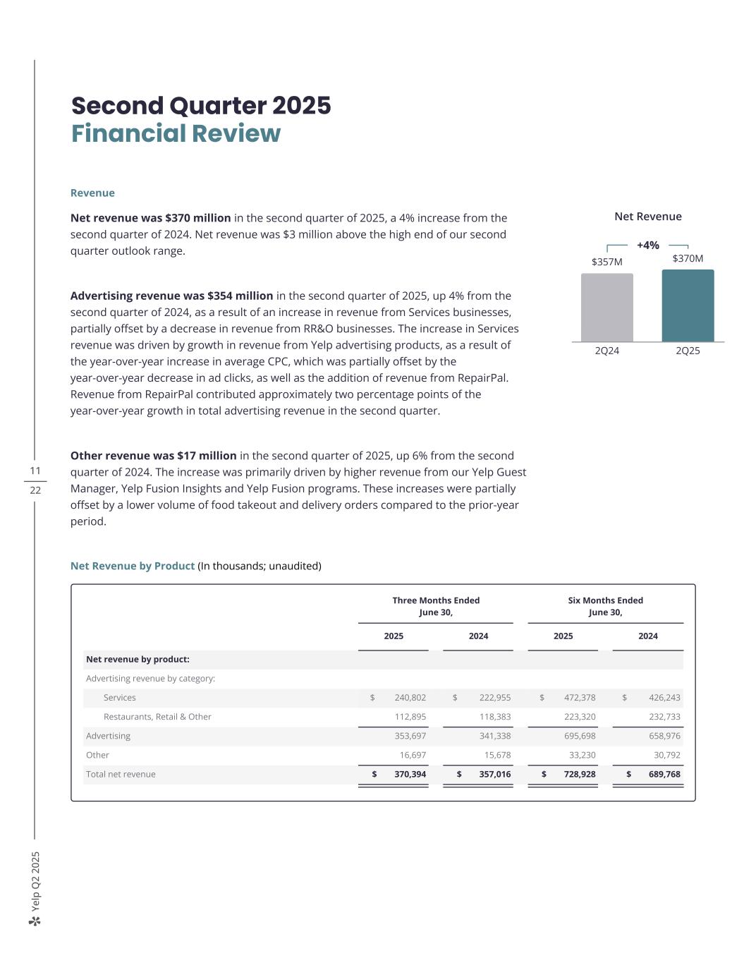 Ye lp Q 2 20 25 11 22 Revenue Net revenue was $370 million in the second quarter of 2025, a 4% increase from the second quarter of 2024. Net revenue was $3 million above the high end of our second quarter outlook range. Advertising revenue was $354 million in the second quarter of 2025, up 4% from the second quarter of 2024, as a result of an increase in revenue from Services businesses, partially offset by a decrease in revenue from RR&O businesses. The increase in Services revenue was driven by growth in revenue from Yelp advertising products, as a result of the year-over-year increase in average CPC, which was partially offset by the year-over-year decrease in ad clicks, as well as the addition of revenue from RepairPal. Revenue from RepairPal contributed approximately two percentage points of the year-over-year growth in total advertising revenue in the second quarter. Other revenue was $17 million in the second quarter of 2025, up 6% from the second quarter of 2024. The increase was primarily driven by higher revenue from our Yelp Guest Manager, Yelp Fusion Insights and Yelp Fusion programs. These increases were partially offset by a lower volume of food takeout and delivery orders compared to the prior-year period. Net Revenue by Product (In thousands; unaudited) Second Quarter 2025 Financial Review Three Months Ended June 30, Six Months Ended June 30, 2025 2024 2025 2024 Net revenue by product: Advertising revenue by category: Services $ 240,802 $ 222,955 $ 472,378 $ 426,243 Restaurants, Retail & Other 112,895 118,383 223,320 232,733 Advertising 353,697 341,338 695,698 658,976 Other 16,697 15,678 33,230 30,792 Total net revenue $ 370,394 $ 357,016 $ 728,928 $ 689,768 Net Revenue +4% $357M $370M 2Q24 2Q25
