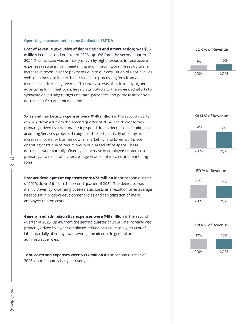 Ye lp Q 2 20 25 12 22 Operating expenses, net income & adjusted EBITDA Cost of revenue (exclusive of depreciation and amortization) was $35 million in the second quarter of 2025, up 16% from the second quarter of 2024. The increase was primarily driven by higher website infrastructure expenses resulting from maintaining and improving our infrastructure, an increase in revenue share payments due to our acquisition of RepairPal, as well as an increase in merchant credit card processing fees from an increase in advertising revenue. The increase was also driven by higher advertising fulfillment costs, largely attributable to the expanded efforts to syndicate advertising budgets on third-party sites and partially offset by a decrease in Yelp Audiences spend. Sales and marketing expenses were $145 million in the second quarter of 2025, down 4% from the second quarter of 2024. The decrease was primarily driven by lower marketing spend due to decreased spending on acquiring Services projects through paid search, partially offset by an increase in costs for business owner marketing, and lower workplace operating costs due to reductions in our leased office space. These decreases were partially offset by an increase in employee-related costs primarily as a result of higher average headcount in sales and marketing roles. Product development expenses were $78 million in the second quarter of 2025, down 5% from the second quarter of 2024. The decrease was mainly driven by lower employee-related costs as a result of lower average headcount in product development roles and capitalization of more employee-related costs. General and administrative expenses were $46 million in the second quarter of 2025, up 4% from the second quarter of 2024. The increase was primarily driven by higher employee-related costs due to higher cost of labor, partially offset by lower average headcount in general and administrative roles. Total costs and expenses were $317 million in the second quarter of 2025, approximately flat year over year. COR % of Revenue 9% 10% 2Q24 2Q25 S&M % of Revenue 42% 39% 2Q24 2Q25 PD % of Revenue 23% 21% 2Q24 2Q25 G&A % of Revenue 13% 13% 2Q24 2Q25