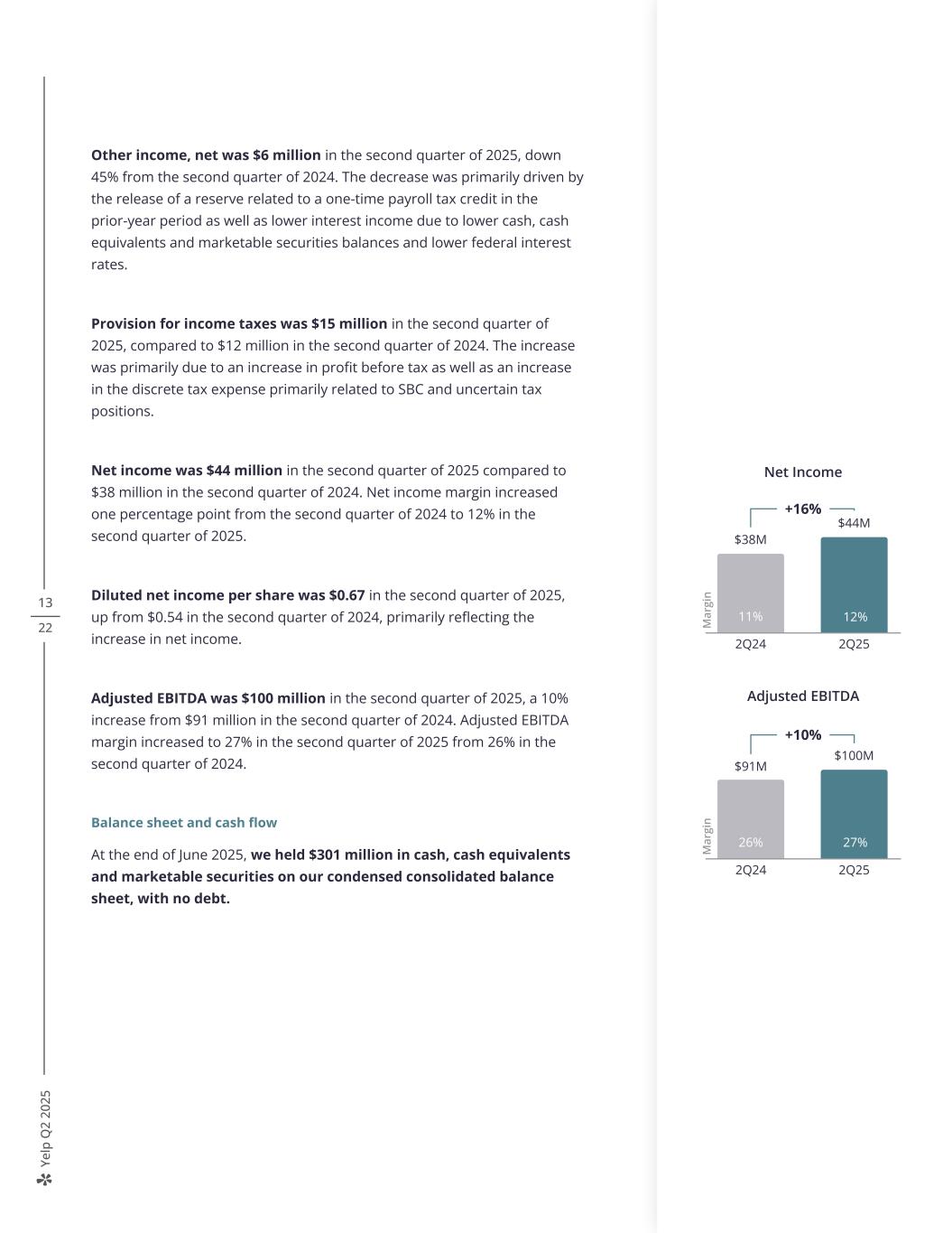 Ye lp Q 2 20 25 13 22 Other income, net was $6 million in the second quarter of 2025, down 45% from the second quarter of 2024. The decrease was primarily driven by the release of a reserve related to a one-time payroll tax credit in the prior-year period as well as lower interest income due to lower cash, cash equivalents and marketable securities balances and lower federal interest rates. Provision for income taxes was $15 million in the second quarter of 2025, compared to $12 million in the second quarter of 2024. The increase was primarily due to an increase in profit before tax as well as an increase in the discrete tax expense primarily related to SBC and uncertain tax positions. Net income was $44 million in the second quarter of 2025 compared to $38 million in the second quarter of 2024. Net income margin increased one percentage point from the second quarter of 2024 to 12% in the second quarter of 2025. Diluted net income per share was $0.67 in the second quarter of 2025, up from $0.54 in the second quarter of 2024, primarily reflecting the increase in net income. Adjusted EBITDA was $100 million in the second quarter of 2025, a 10% increase from $91 million in the second quarter of 2024. Adjusted EBITDA margin increased to 27% in the second quarter of 2025 from 26% in the second quarter of 2024. Balance sheet and cash flow At the end of June 2025, we held $301 million in cash, cash equivalents and marketable securities on our condensed consolidated balance sheet, with no debt. 19% 17% 19% 17% 8% 7% M ar gi n Net Income +16% $38M $44M 2Q24 2Q25 12%11% Adjusted EBITDA +10% $91M $100M 2Q24 2Q25 M ar gi n 26% 27%