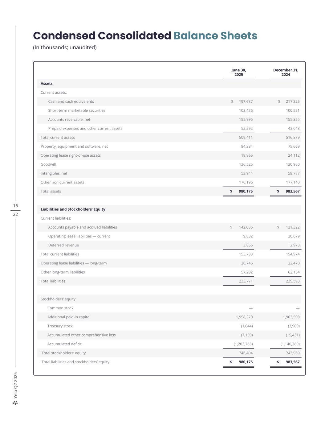 Ye lp Q 2 20 25 16 22 Condensed Consolidated Balance Sheets (In thousands; unaudited) June 30, 2025 December 31, 2024 Assets Current assets: Cash and cash equivalents $ 197,687 $ 217,325 Short-term marketable securities 103,436 100,581 Accounts receivable, net 155,996 155,325 Prepaid expenses and other current assets 52,292 43,648 Total current assets 509,411 516,879 Property, equipment and software, net 84,234 75,669 Operating lease right-of-use assets 19,865 24,112 Goodwill 136,525 130,980 Intangibles, net 53,944 58,787 Other non-current assets 176,196 177,140 Total assets $ 980,175 $ 983,567 Liabilities and Stockholders’ Equity Current liabilities: Accounts payable and accrued liabilities $ 142,036 $ 131,322 Operating lease liabilities — current 9,832 20,679 Deferred revenue 3,865 2,973 Total current liabilities 155,733 154,974 Operating lease liabilities — long-term 20,746 22,470 Other long-term liabilities 57,292 62,154 Total liabilities 233,771 239,598 Stockholders’ equity: Common stock — — Additional paid-in capital 1,958,370 1,903,598 Treasury stock (1,044) (3,909) Accumulated other comprehensive loss (7,139) (15,431) Accumulated deficit (1,203,783) (1,140,289) Total stockholders’ equity 746,404 743,969 Total liabilities and stockholders’ equity $ 980,175 $ 983,567