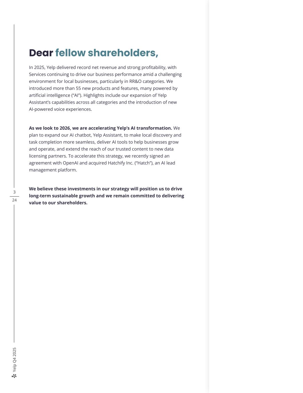 Ye lp Q 4 20 25 3 24 Dear fellow shareholders, In 2025, Yelp delivered record net revenue and strong profitability, with Services continuing to drive our business performance amid a challenging environment for local businesses, particularly in RR&O categories. We introduced more than 55 new products and features, many powered by artificial intelligence (“AI”). Highlights include our expansion of Yelp Assistant’s capabilities across all categories and the introduction of new AI-powered voice experiences. As we look to 2026, we are accelerating Yelp’s AI transformation. We plan to expand our AI chatbot, Yelp Assistant, to make local discovery and task completion more seamless, deliver AI tools to help businesses grow and operate, and extend the reach of our trusted content to new data licensing partners. To accelerate this strategy, we recently signed an agreement with OpenAI and acquired Hatchify Inc. (“Hatch”), an AI lead management platform. We believe these investments in our strategy will position us to drive long-term sustainable growth and we remain committed to delivering value to our shareholders. +2 ppt 3% 4% 2Q22 2Q23 Net Income Margin