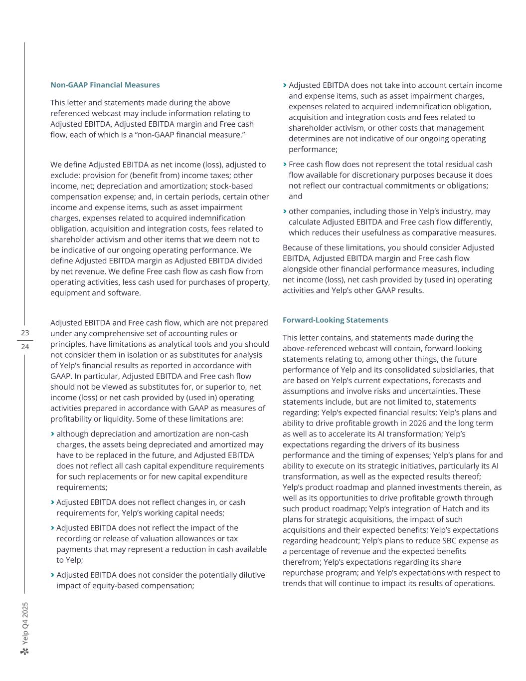 Ye lp Q 4 20 25 Non-GAAP Financial Measures This letter and statements made during the above referenced webcast may include information relating to Adjusted EBITDA, Adjusted EBITDA margin and Free cash flow, each of which is a “non-GAAP financial measure.” We define Adjusted EBITDA as net income (loss), adjusted to exclude: provision for (benefit from) income taxes; other income, net; depreciation and amortization; stock-based compensation expense; and, in certain periods, certain other income and expense items, such as asset impairment charges, expenses related to acquired indemnification obligation, acquisition and integration costs, fees related to shareholder activism and other items that we deem not to be indicative of our ongoing operating performance. We define Adjusted EBITDA margin as Adjusted EBITDA divided by net revenue. We define Free cash flow as cash flow from operating activities, less cash used for purchases of property, equipment and software. Adjusted EBITDA and Free cash flow, which are not prepared under any comprehensive set of accounting rules or principles, have limitations as analytical tools and you should not consider them in isolation or as substitutes for analysis of Yelp’s financial results as reported in accordance with GAAP. In particular, Adjusted EBITDA and Free cash flow should not be viewed as substitutes for, or superior to, net income (loss) or net cash provided by (used in) operating activities prepared in accordance with GAAP as measures of profitability or liquidity. Some of these limitations are: > although depreciation and amortization are non-cash charges, the assets being depreciated and amortized may have to be replaced in the future, and Adjusted EBITDA does not reflect all cash capital expenditure requirements for such replacements or for new capital expenditure requirements; > Adjusted EBITDA does not reflect changes in, or cash requirements for, Yelp’s working capital needs; > Adjusted EBITDA does not reflect the impact of the recording or release of valuation allowances or tax payments that may represent a reduction in cash available to Yelp; > Adjusted EBITDA does not consider the potentially dilutive impact of equity-based compensation; > Adjusted EBITDA does not take into account certain income and expense items, such as asset impairment charges, expenses related to acquired indemnification obligation, acquisition and integration costs and fees related to shareholder activism, or other costs that management determines are not indicative of our ongoing operating performance; > Free cash flow does not represent the total residual cash flow available for discretionary purposes because it does not reflect our contractual commitments or obligations; and > other companies, including those in Yelp’s industry, may calculate Adjusted EBITDA and Free cash flow differently, which reduces their usefulness as comparative measures. Because of these limitations, you should consider Adjusted EBITDA, Adjusted EBITDA margin and Free cash flow alongside other financial performance measures, including net income (loss), net cash provided by (used in) operating activities and Yelp’s other GAAP results. Forward-Looking Statements This letter contains, and statements made during the above-referenced webcast will contain, forward-looking statements relating to, among other things, the future performance of Yelp and its consolidated subsidiaries, that are based on Yelp’s current expectations, forecasts and assumptions and involve risks and uncertainties. These statements include, but are not limited to, statements regarding: Yelp’s expected financial results; Yelp’s plans and ability to drive profitable growth in 2026 and the long term as well as to accelerate its AI transformation; Yelp’s expectations regarding the drivers of its business performance and the timing of expenses; Yelp’s plans for and ability to execute on its strategic initiatives, particularly its AI transformation, as well as the expected results thereof; Yelp’s product roadmap and planned investments therein, as well as its opportunities to drive profitable growth through such product roadmap; Yelp’s integration of Hatch and its plans for strategic acquisitions, the impact of such acquisitions and their expected benefits; Yelp’s expectations regarding headcount; Yelp’s plans to reduce SBC expense as a percentage of revenue and the expected benefits therefrom; Yelp’s expectations regarding its share repurchase program; and Yelp’s expectations with respect to trends that will continue to impact its results of operations. 23 24