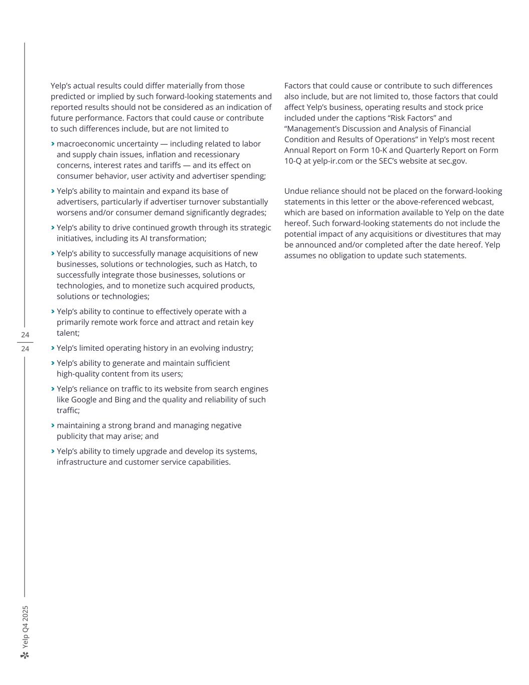 Ye lp Q 4 20 25 Yelp’s actual results could differ materially from those predicted or implied by such forward-looking statements and reported results should not be considered as an indication of future performance. Factors that could cause or contribute to such differences include, but are not limited to > macroeconomic uncertainty — including related to labor and supply chain issues, inflation and recessionary concerns, interest rates and tariffs — and its effect on consumer behavior, user activity and advertiser spending; > Yelp’s ability to maintain and expand its base of advertisers, particularly if advertiser turnover substantially worsens and/or consumer demand significantly degrades; > Yelp’s ability to drive continued growth through its strategic initiatives, including its AI transformation; > Yelp’s ability to successfully manage acquisitions of new businesses, solutions or technologies, such as Hatch, to successfully integrate those businesses, solutions or technologies, and to monetize such acquired products, solutions or technologies; > Yelp’s ability to continue to effectively operate with a primarily remote work force and attract and retain key talent; > Yelp’s limited operating history in an evolving industry; > Yelp’s ability to generate and maintain sufficient high-quality content from its users; > Yelp’s reliance on traffic to its website from search engines like Google and Bing and the quality and reliability of such traffic; > maintaining a strong brand and managing negative publicity that may arise; and > Yelp’s ability to timely upgrade and develop its systems, infrastructure and customer service capabilities. Factors that could cause or contribute to such differences also include, but are not limited to, those factors that could affect Yelp’s business, operating results and stock price included under the captions “Risk Factors” and “Management’s Discussion and Analysis of Financial Condition and Results of Operations” in Yelp’s most recent Annual Report on Form 10-K and Quarterly Report on Form 10-Q at yelp-ir.com or the SEC’s website at sec.gov. Undue reliance should not be placed on the forward-looking statements in this letter or the above-referenced webcast, which are based on information available to Yelp on the date hereof. Such forward-looking statements do not include the potential impact of any acquisitions or divestitures that may be announced and/or completed after the date hereof. Yelp assumes no obligation to update such statements. 24 24