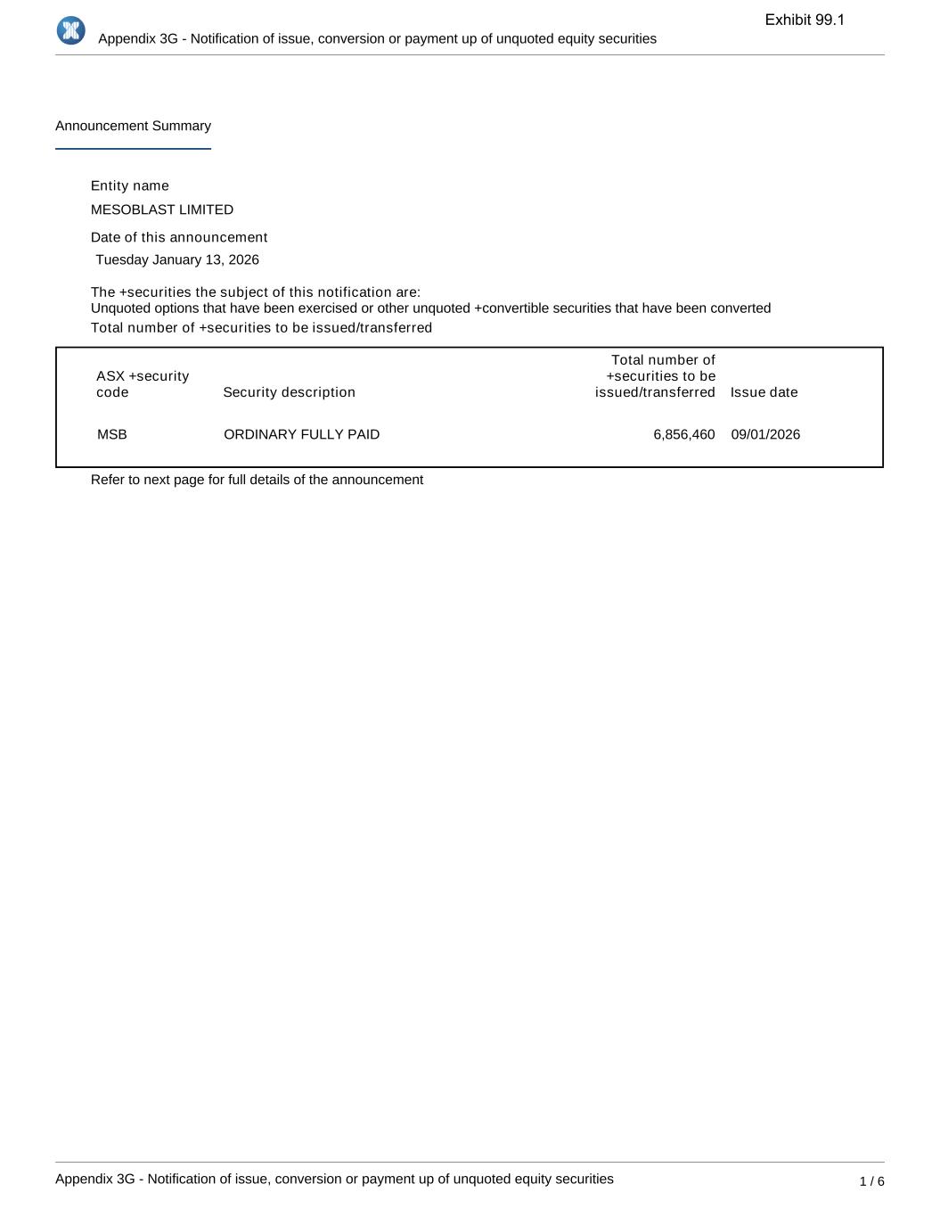 Appendix 3G - Notification of issue, conversion or payment up of unquoted equity securities Appendix 3G - Notification of issue, conversion or payment up of unquoted equity securities 1 / 6 Announcement Summary Entity name MESOBLAST LIMITED Date of this announcement Tuesday January 13, 2026 The +securities the subject of this notification are: Total number of +securities to be issued/transferred ASX +security code Security description Total number of +securities to be issued/transferred Issue date MSB ORDINARY FULLY PAID 6,856,460 09/01/2026 Refer to next page for full details of the announcement Unquoted options that have been exercised or other unquoted +convertible securities that have been converted