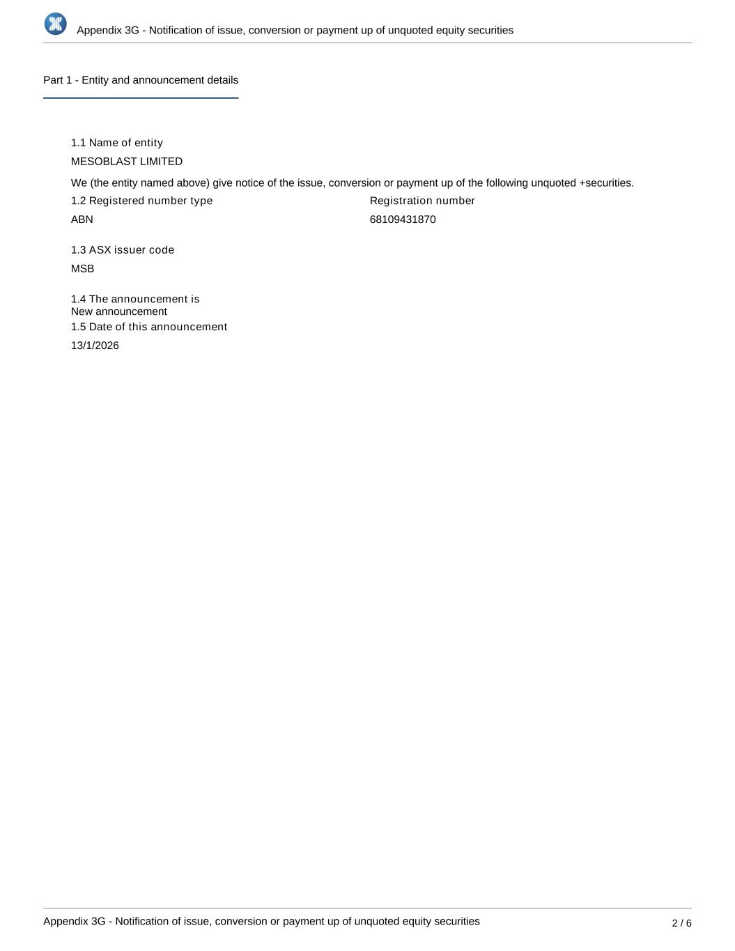 Appendix 3G - Notification of issue, conversion or payment up of unquoted equity securities Appendix 3G - Notification of issue, conversion or payment up of unquoted equity securities 2 / 6 Part 1 - Entity and announcement details 1.1 Name of entity MESOBLAST LIMITED We (the entity named above) give notice of the issue, conversion or payment up of the following unquoted +securities. 1.2 Registered number type ABN Registration number 68109431870 1.3 ASX issuer code MSB 1.4 The announcement is 1.5 Date of this announcement 13/1/2026 New announcement