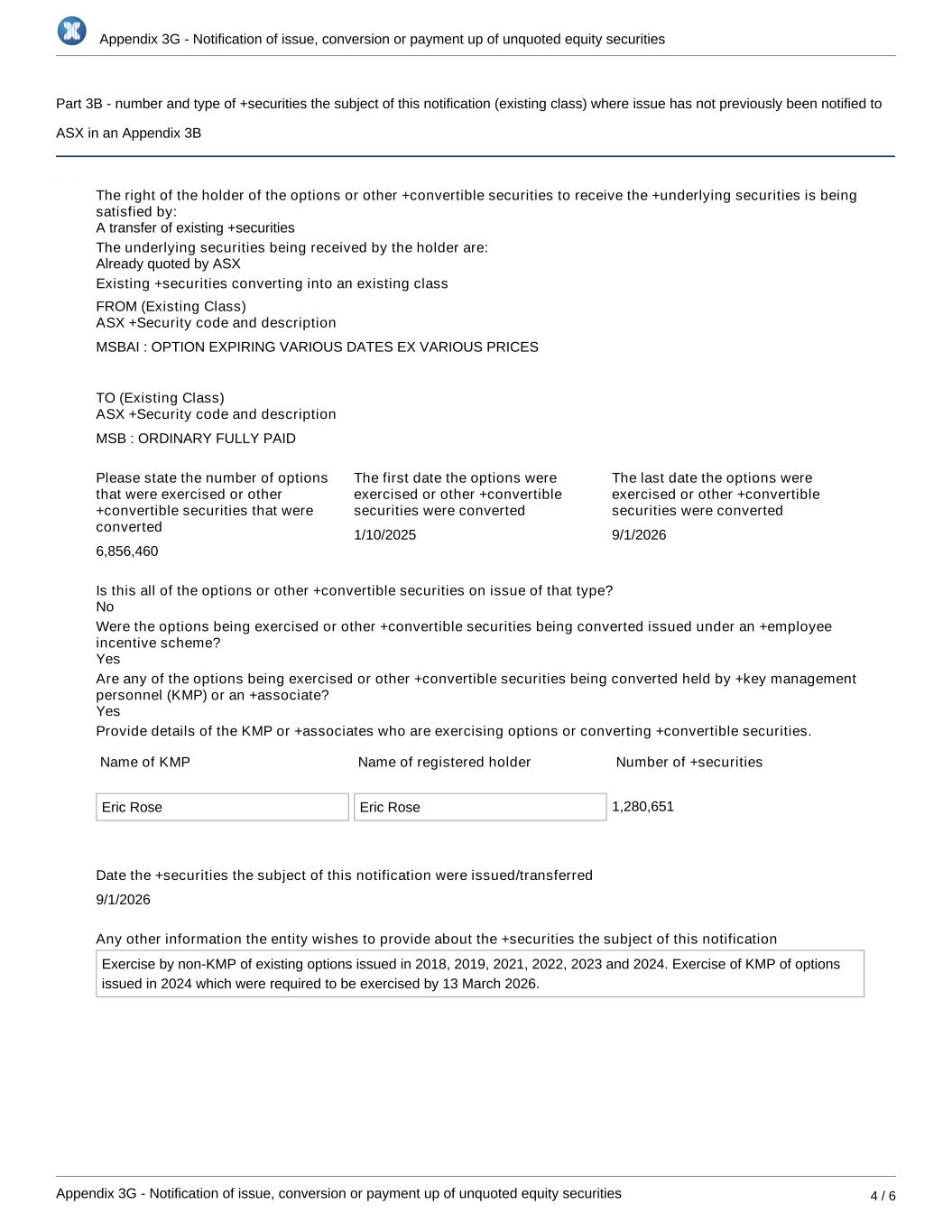 Appendix 3G - Notification of issue, conversion or payment up of unquoted equity securities Appendix 3G - Notification of issue, conversion or payment up of unquoted equity securities 4 / 6 Part 3B - number and type of +securities the subject of this notification (existing class) where issue has not previously been notified to ASX in an Appendix 3B The right of the holder of the options or other +convertible securities to receive the +underlying securities is being satisfied by: The underlying securities being received by the holder are: Existing +securities converting into an existing class FROM (Existing Class) ASX +Security code and description MSBAI : OPTION EXPIRING VARIOUS DATES EX VARIOUS PRICES TO (Existing Class) ASX +Security code and description MSB : ORDINARY FULLY PAID Please state the number of options that were exercised or other +convertible securities that were converted 6,856,460 The first date the options were exercised or other +convertible securities were converted 1/10/2025 The last date the options were exercised or other +convertible securities were converted 9/1/2026 Is this all of the options or other +convertible securities on issue of that type? Were the options being exercised or other +convertible securities being converted issued under an +employee incentive scheme? Are any of the options being exercised or other +convertible securities being converted held by +key management personnel (KMP) or an +associate? Provide details of the KMP or +associates who are exercising options or converting +convertible securities. Name of KMP Name of registered holder Number of +securities Eric Rose Eric Rose 1,280,651 Date the +securities the subject of this notification were issued/transferred 9/1/2026 Any other information the entity wishes to provide about the +securities the subject of this notification Exercise by non-KMP of existing options issued in 2018, 2019, 2021, 2022, 2023 and 2024. Exercise of KMP of options issued in 2024 which were required to be exercised by 13 March 2026. Yes Yes No Already quoted by ASX A transfer of existing +securities