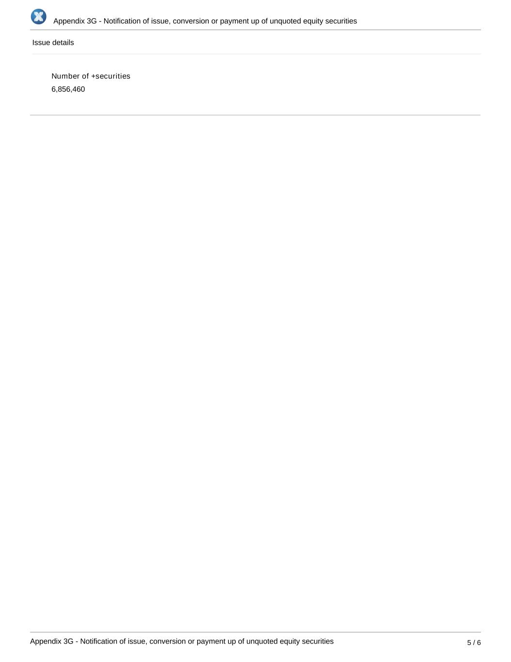 Appendix 3G - Notification of issue, conversion or payment up of unquoted equity securities Appendix 3G - Notification of issue, conversion or payment up of unquoted equity securities 5 / 6 Issue details Number of +securities 6,856,460