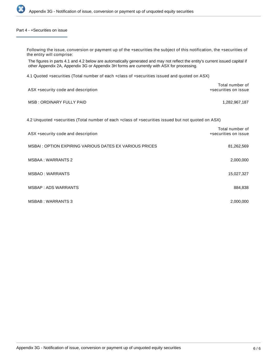 Appendix 3G - Notification of issue, conversion or payment up of unquoted equity securities Appendix 3G - Notification of issue, conversion or payment up of unquoted equity securities 6 / 6 Part 4 - +Securities on issue Following the issue, conversion or payment up of the +securities the subject of this notification, the +securities of the entity will comprise: The figures in parts 4.1 and 4.2 below are automatically generated and may not reflect the entity's current issued capital if other Appendix 2A, Appendix 3G or Appendix 3H forms are currently with ASX for processing. 4.1 Quoted +securities (Total number of each +class of +securities issued and quoted on ASX) ASX +security code and description Total number of +securities on issue MSB : ORDINARY FULLY PAID 1,282,967,187 4.2 Unquoted +securities (Total number of each +class of +securities issued but not quoted on ASX) ASX +security code and description Total number of +securities on issue MSBAI : OPTION EXPIRING VARIOUS DATES EX VARIOUS PRICES 81,262,569 MSBAA : WARRANTS 2 2,000,000 MSBAO : WARRANTS 15,027,327 MSBAP : ADS WARRANTS 884,838 MSBAB : WARRANTS 3 2,000,000