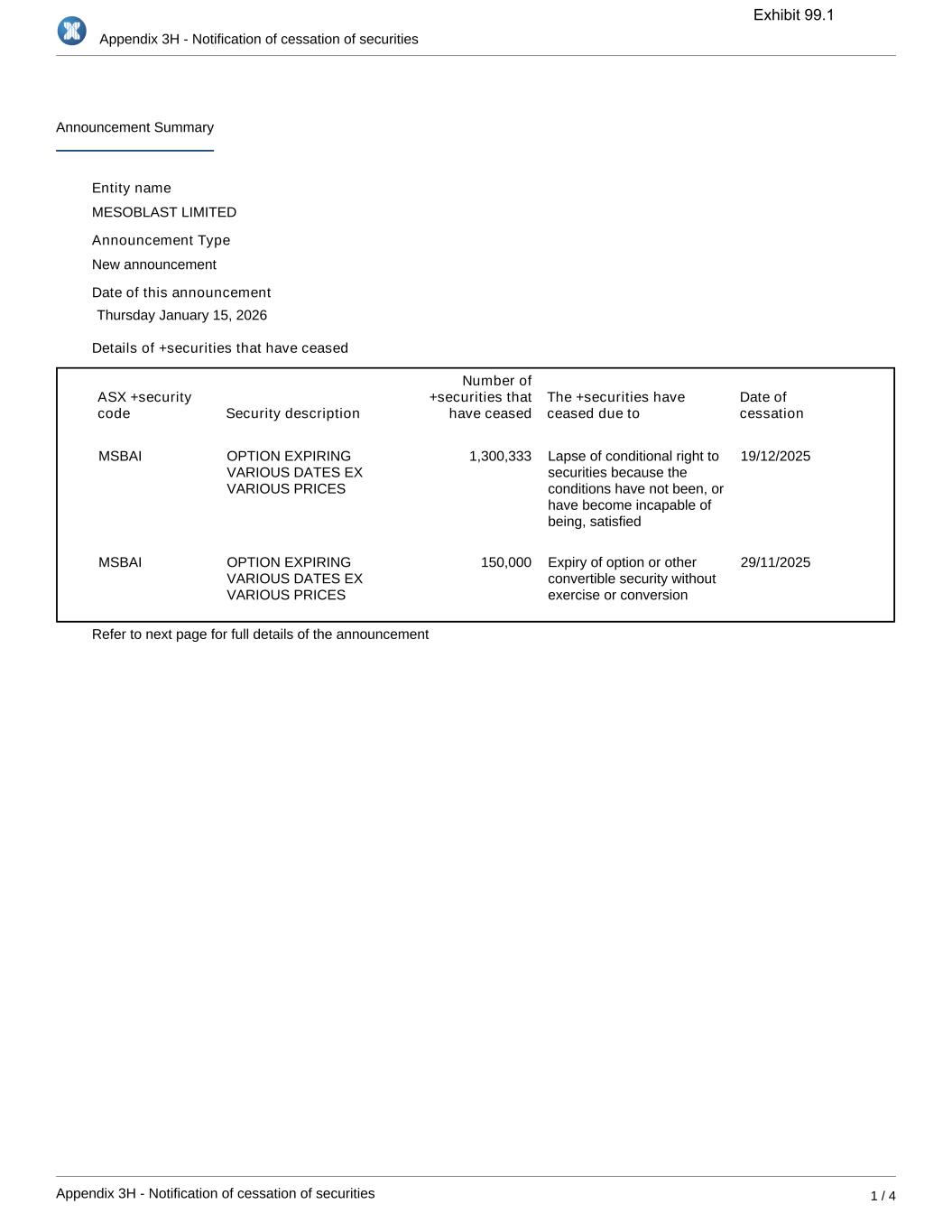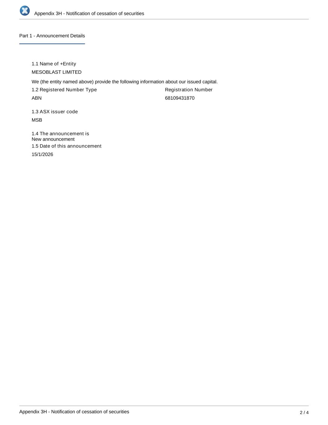 Appendix 3H - Notification of cessation of securities Appendix 3H - Notification of cessation of securities 2 / 4 Part 1 - Announcement Details 1.1 Name of +Entity MESOBLAST LIMITED We (the entity named above) provide the following information about our issued capital. 1.2 Registered Number Type ABN Registration Number 68109431870 1.3 ASX issuer code MSB 1.4 The announcement is 1.5 Date of this announcement 15/1/2026 New announcement