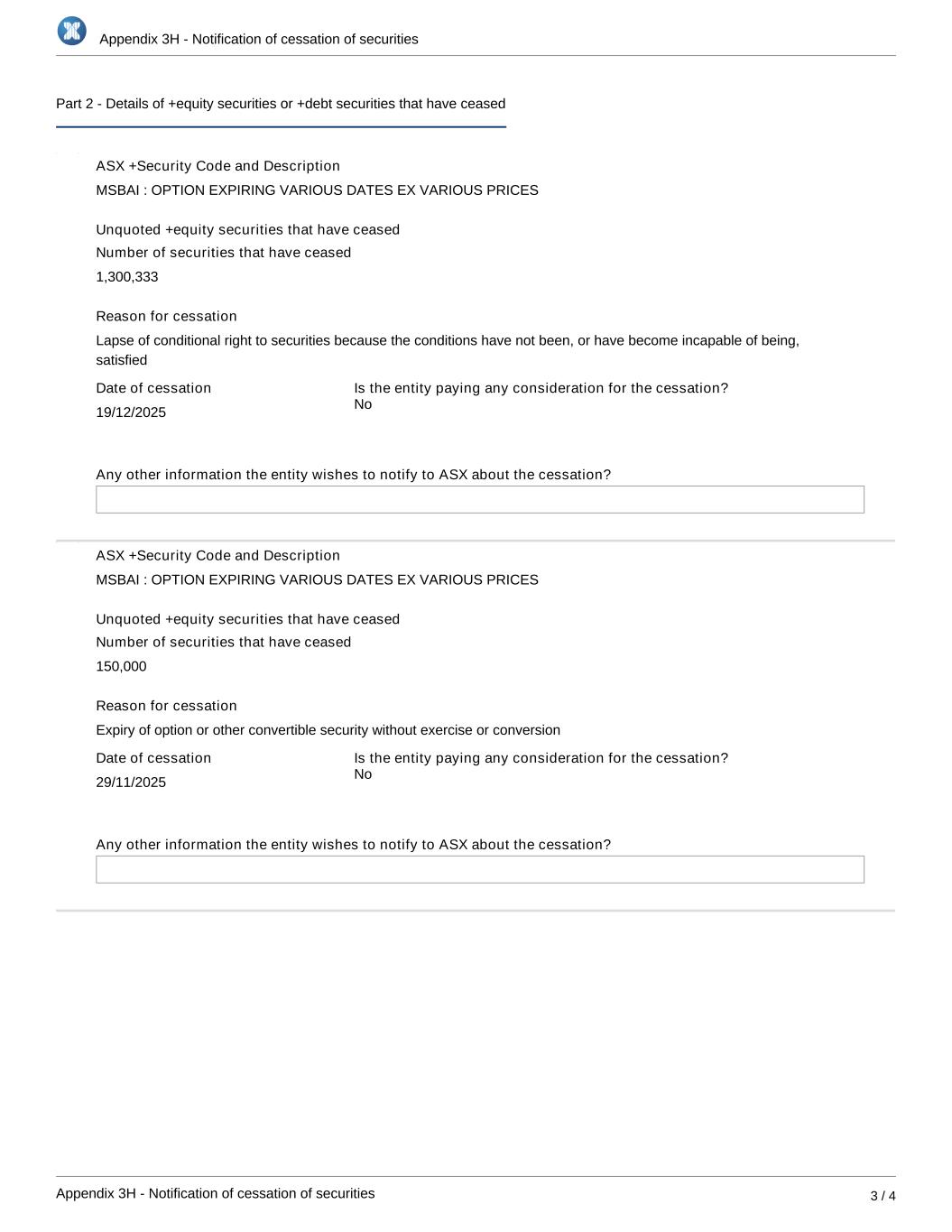 Appendix 3H - Notification of cessation of securities Appendix 3H - Notification of cessation of securities 3 / 4 Part 2 - Details of +equity securities or +debt securities that have ceased ASX +Security Code and Description MSBAI : OPTION EXPIRING VARIOUS DATES EX VARIOUS PRICES Unquoted +equity securities that have ceased Number of securities that have ceased 1,300,333 Reason for cessation Lapse of conditional right to securities because the conditions have not been, or have become incapable of being, satisfied Date of cessation 19/12/2025 Is the entity paying any consideration for the cessation? Any other information the entity wishes to notify to ASX about the cessation? ASX +Security Code and Description MSBAI : OPTION EXPIRING VARIOUS DATES EX VARIOUS PRICES Unquoted +equity securities that have ceased Number of securities that have ceased 150,000 Reason for cessation Expiry of option or other convertible security without exercise or conversion Date of cessation 29/11/2025 Is the entity paying any consideration for the cessation? Any other information the entity wishes to notify to ASX about the cessation? No No