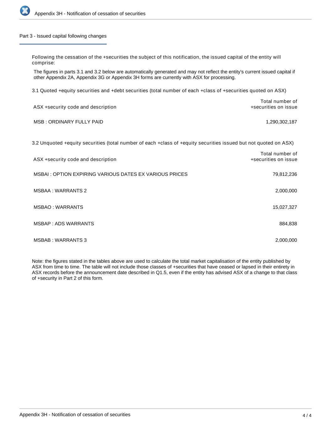 Appendix 3H - Notification of cessation of securities Appendix 3H - Notification of cessation of securities 4 / 4 Part 3 - Issued capital following changes Following the cessation of the +securities the subject of this notification, the issued capital of the entity will comprise: The figures in parts 3.1 and 3.2 below are automatically generated and may not reflect the entity's current issued capital if other Appendix 2A, Appendix 3G or Appendix 3H forms are currently with ASX for processing. 3.1 Quoted +equity securities and +debt securities (total number of each +class of +securities quoted on ASX) ASX +security code and description Total number of +securities on issue MSB : ORDINARY FULLY PAID 1,290,302,187 3.2 Unquoted +equity securities (total number of each +class of +equity securities issued but not quoted on ASX) ASX +security code and description Total number of +securities on issue MSBAI : OPTION EXPIRING VARIOUS DATES EX VARIOUS PRICES 79,812,236 MSBAA : WARRANTS 2 2,000,000 MSBAO : WARRANTS 15,027,327 MSBAP : ADS WARRANTS 884,838 MSBAB : WARRANTS 3 2,000,000 Note: the figures stated in the tables above are used to calculate the total market capitalisation of the entity published by ASX from time to time. The table will not include those classes of +securities that have ceased or lapsed in their entirety in ASX records before the announcement date described in Q1.5, even if the entity has advised ASX of a change to that class of +security in Part 2 of this form.