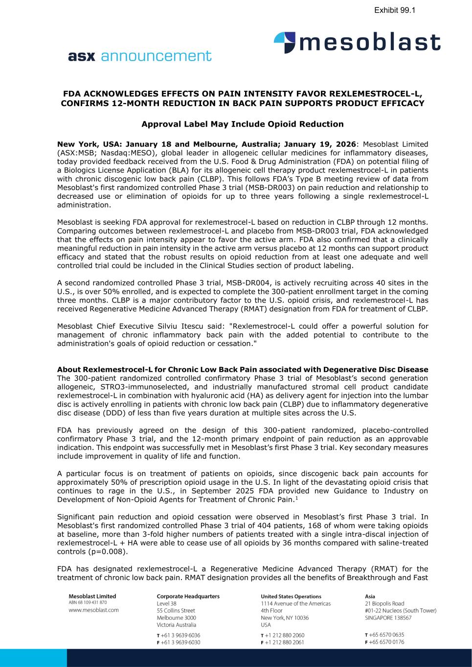 FDA ACKNOWLEDGES EFFECTS ON PAIN INTENSITY FAVOR REXLEMESTROCEL-L, CONFIRMS 12-MONTH REDUCTION IN BACK PAIN SUPPORTS PRODUCT EFFICACY Approval Label May Include Opioid Reduction New York, USA: January 18 and Melbourne, Australia; January 19, 2026: Mesoblast Limited (ASX:MSB; Nasdaq:MESO), global leader in allogeneic cellular medicines for inflammatory diseases, today provided feedback received from the U.S. Food & Drug Administration (FDA) on potential filing of a Biologics License Application (BLA) for its allogeneic cell therapy product rexlemestrocel-L in patients with chronic discogenic low back pain (CLBP). This follows FDA’s Type B meeting review of data from Mesoblast's first randomized controlled Phase 3 trial (MSB-DR003) on pain reduction and relationship to decreased use or elimination of opioids for up to three years following a single rexlemestrocel-L administration. Mesoblast is seeking FDA approval for rexlemestrocel-L based on reduction in CLBP through 12 months. Comparing outcomes between rexlemestrocel-L and placebo from MSB-DR003 trial, FDA acknowledged that the effects on pain intensity appear to favor the active arm. FDA also confirmed that a clinically meaningful reduction in pain intensity in the active arm versus placebo at 12 months can support product efficacy and stated that the robust results on opioid reduction from at least one adequate and well controlled trial could be included in the Clinical Studies section of product labeling. A second randomized controlled Phase 3 trial, MSB-DR004, is actively recruiting across 40 sites in the U.S., is over 50% enrolled, and is expected to complete the 300-patient enrollment target in the coming three months. CLBP is a major contributory factor to the U.S. opioid crisis, and rexlemestrocel-L has received Regenerative Medicine Advanced Therapy (RMAT) designation from FDA for treatment of CLBP. Mesoblast Chief Executive Silviu Itescu said: "Rexlemestrocel-L could offer a powerful solution for management of chronic inflammatory back pain with the added potential to contribute to the administration's goals of opioid reduction or cessation." About Rexlemestrocel-L for Chronic Low Back Pain associated with Degenerative Disc Disease The 300-patient randomized controlled confirmatory Phase 3 trial of Mesoblast’s second generation allogeneic, STRO3-immunoselected, and industrially manufactured stromal cell product candidate rexlemestrocel-L in combination with hyaluronic acid (HA) as delivery agent for injection into the lumbar disc is actively enrolling in patients with chronic low back pain (CLBP) due to inflammatory degenerative disc disease (DDD) of less than five years duration at multiple sites across the U.S. FDA has previously agreed on the design of this 300-patient randomized, placebo-controlled confirmatory Phase 3 trial, and the 12-month primary endpoint of pain reduction as an approvable indication. This endpoint was successfully met in Mesoblast’s first Phase 3 trial. Key secondary measures include improvement in quality of life and function. A particular focus is on treatment of patients on opioids, since discogenic back pain accounts for approximately 50% of prescription opioid usage in the U.S. In light of the devastating opioid crisis that continues to rage in the U.S., in September 2025 FDA provided new Guidance to Industry on Development of Non-Opioid Agents for Treatment of Chronic Pain.1 Significant pain reduction and opioid cessation were observed in Mesoblast’s first Phase 3 trial. In Mesoblast's first randomized controlled Phase 3 trial of 404 patients, 168 of whom were taking opioids at baseline, more than 3-fold higher numbers of patients treated with a single intra-discal injection of rexlemestrocel-L + HA were able to cease use of all opioids by 36 months compared with saline-treated controls (p=0.008). FDA has designated rexlemestrocel-L a Regenerative Medicine Advanced Therapy (RMAT) for the treatment of chronic low back pain. RMAT designation provides all the benefits of Breakthrough and Fast
