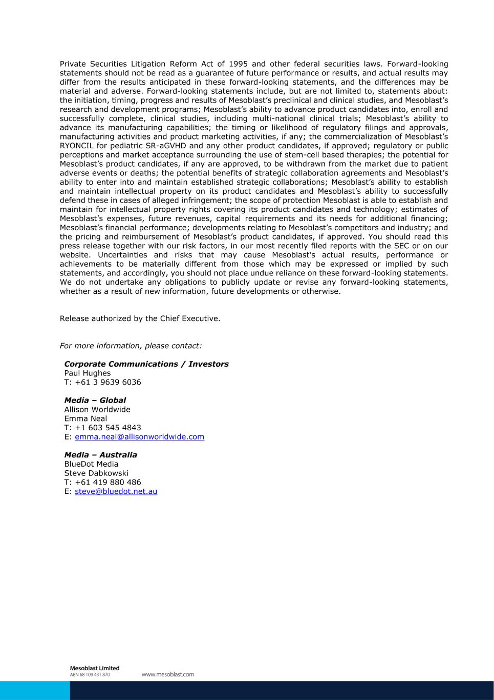 Private Securities Litigation Reform Act of 1995 and other federal securities laws. Forward-looking statements should not be read as a guarantee of future performance or results, and actual results may differ from the results anticipated in these forward-looking statements, and the differences may be material and adverse. Forward-looking statements include, but are not limited to, statements about: the initiation, timing, progress and results of Mesoblast’s preclinical and clinical studies, and Mesoblast’s research and development programs; Mesoblast’s ability to advance product candidates into, enroll and successfully complete, clinical studies, including multi-national clinical trials; Mesoblast’s ability to advance its manufacturing capabilities; the timing or likelihood of regulatory filings and approvals, manufacturing activities and product marketing activities, if any; the commercialization of Mesoblast’s RYONCIL for pediatric SR-aGVHD and any other product candidates, if approved; regulatory or public perceptions and market acceptance surrounding the use of stem-cell based therapies; the potential for Mesoblast’s product candidates, if any are approved, to be withdrawn from the market due to patient adverse events or deaths; the potential benefits of strategic collaboration agreements and Mesoblast’s ability to enter into and maintain established strategic collaborations; Mesoblast’s ability to establish and maintain intellectual property on its product candidates and Mesoblast’s ability to successfully defend these in cases of alleged infringement; the scope of protection Mesoblast is able to establish and maintain for intellectual property rights covering its product candidates and technology; estimates of Mesoblast’s expenses, future revenues, capital requirements and its needs for additional financing; Mesoblast’s financial performance; developments relating to Mesoblast’s competitors and industry; and the pricing and reimbursement of Mesoblast’s product candidates, if approved. You should read this press release together with our risk factors, in our most recently filed reports with the SEC or on our website. Uncertainties and risks that may cause Mesoblast’s actual results, performance or achievements to be materially different from those which may be expressed or implied by such statements, and accordingly, you should not place undue reliance on these forward-looking statements. We do not undertake any obligations to publicly update or revise any forward-looking statements, whether as a result of new information, future developments or otherwise. Release authorized by the Chief Executive. For more information, please contact: Corporate Communications / Investors Paul Hughes T: +61 3 9639 6036 Media – Global Allison Worldwide Emma Neal T: +1 603 545 4843 E: emma.neal@allisonworldwide.com Media – Australia BlueDot Media Steve Dabkowski T: +61 419 880 486 E: steve@bluedot.net.au
