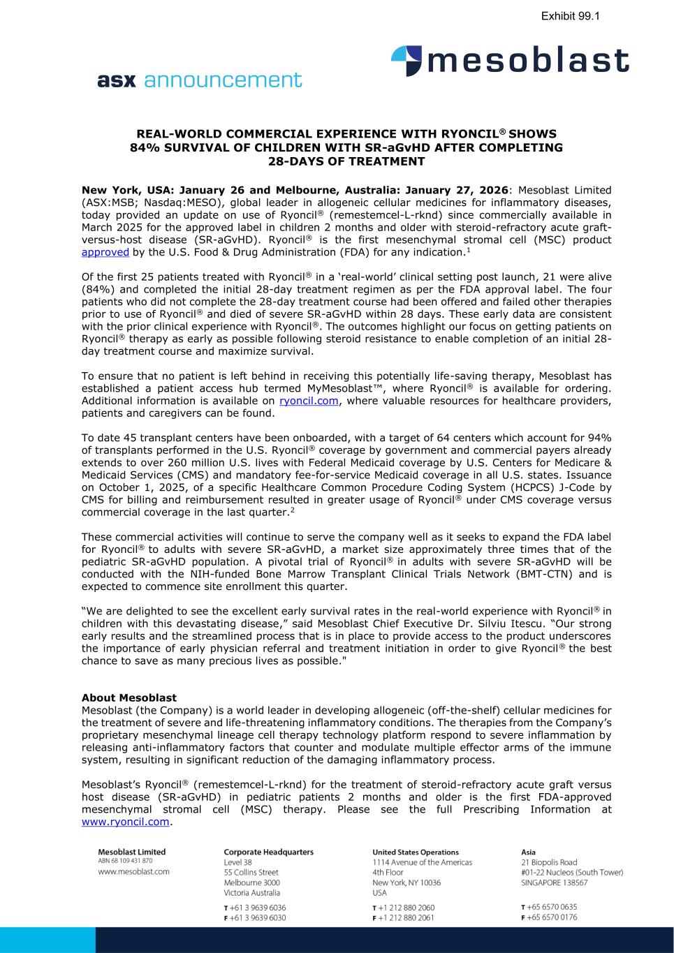 REAL-WORLD COMMERCIAL EXPERIENCE WITH RYONCIL® SHOWS 84% SURVIVAL OF CHILDREN WITH SR-aGvHD AFTER COMPLETING 28-DAYS OF TREATMENT New York, USA: January 26 and Melbourne, Australia: January 27, 2026: Mesoblast Limited (ASX:MSB; Nasdaq:MESO), global leader in allogeneic cellular medicines for inflammatory diseases, today provided an update on use of Ryoncil® (remestemcel-L-rknd) since commercially available in March 2025 for the approved label in children 2 months and older with steroid-refractory acute graft- versus-host disease (SR-aGvHD). Ryoncil® is the first mesenchymal stromal cell (MSC) product approved by the U.S. Food & Drug Administration (FDA) for any indication.1 Of the first 25 patients treated with Ryoncil® in a ‘real-world’ clinical setting post launch, 21 were alive (84%) and completed the initial 28-day treatment regimen as per the FDA approval label. The four patients who did not complete the 28-day treatment course had been offered and failed other therapies prior to use of Ryoncil® and died of severe SR-aGvHD within 28 days. These early data are consistent with the prior clinical experience with Ryoncil®. The outcomes highlight our focus on getting patients on Ryoncil® therapy as early as possible following steroid resistance to enable completion of an initial 28- day treatment course and maximize survival. To ensure that no patient is left behind in receiving this potentially life-saving therapy, Mesoblast has established a patient access hub termed MyMesoblast™, where Ryoncil® is available for ordering. Additional information is available on ryoncil.com, where valuable resources for healthcare providers, patients and caregivers can be found. To date 45 transplant centers have been onboarded, with a target of 64 centers which account for 94% of transplants performed in the U.S. Ryoncil® coverage by government and commercial payers already extends to over 260 million U.S. lives with Federal Medicaid coverage by U.S. Centers for Medicare & Medicaid Services (CMS) and mandatory fee-for-service Medicaid coverage in all U.S. states. Issuance on October 1, 2025, of a specific Healthcare Common Procedure Coding System (HCPCS) J-Code by CMS for billing and reimbursement resulted in greater usage of Ryoncil® under CMS coverage versus commercial coverage in the last quarter.2 These commercial activities will continue to serve the company well as it seeks to expand the FDA label for Ryoncil® to adults with severe SR-aGvHD, a market size approximately three times that of the pediatric SR-aGvHD population. A pivotal trial of Ryoncil® in adults with severe SR-aGvHD will be conducted with the NIH-funded Bone Marrow Transplant Clinical Trials Network (BMT-CTN) and is expected to commence site enrollment this quarter. “We are delighted to see the excellent early survival rates in the real-world experience with Ryoncil® in children with this devastating disease,” said Mesoblast Chief Executive Dr. Silviu Itescu. “Our strong early results and the streamlined process that is in place to provide access to the product underscores the importance of early physician referral and treatment initiation in order to give Ryoncil® the best chance to save as many precious lives as possible." About Mesoblast Mesoblast (the Company) is a world leader in developing allogeneic (off-the-shelf) cellular medicines for the treatment of severe and life-threatening inflammatory conditions. The therapies from the Company’s proprietary mesenchymal lineage cell therapy technology platform respond to severe inflammation by releasing anti-inflammatory factors that counter and modulate multiple effector arms of the immune system, resulting in significant reduction of the damaging inflammatory process. Mesoblast’s Ryoncil® (remestemcel-L-rknd) for the treatment of steroid-refractory acute graft versus host disease (SR-aGvHD) in pediatric patients 2 months and older is the first FDA-approved mesenchymal stromal cell (MSC) therapy. Please see the full Prescribing Information at www.ryoncil.com.