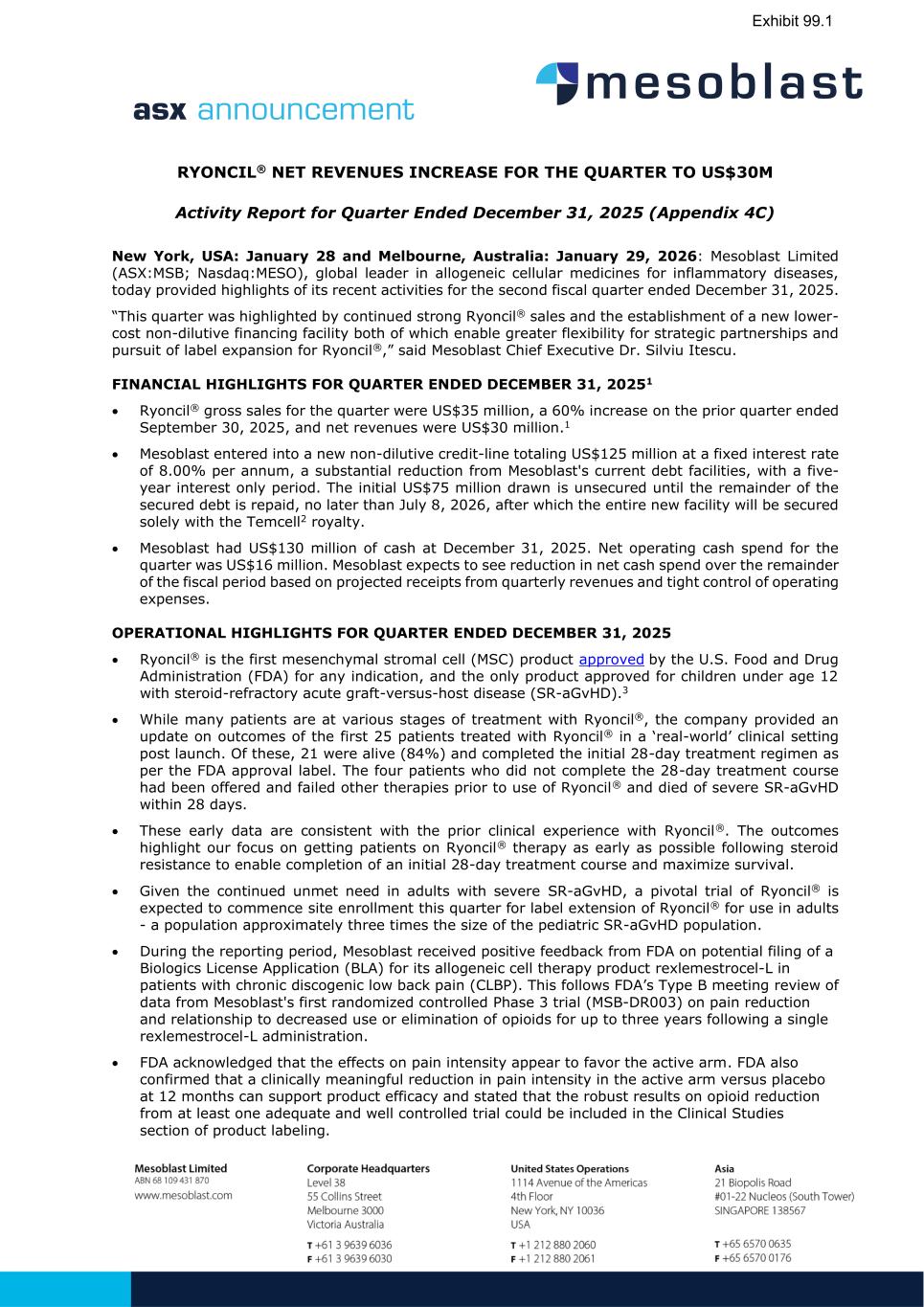 RYONCIL® NET REVENUES INCREASE FOR THE QUARTER TO US$30M Activity Report for Quarter Ended December 31, 2025 (Appendix 4C) New York, USA: January 28 and Melbourne, Australia: January 29, 2026: Mesoblast Limited (ASX:MSB; Nasdaq:MESO), global leader in allogeneic cellular medicines for inflammatory diseases, today provided highlights of its recent activities for the second fiscal quarter ended December 31, 2025. “This quarter was highlighted by continued strong Ryoncil® sales and the establishment of a new lower- cost non-dilutive financing facility both of which enable greater flexibility for strategic partnerships and pursuit of label expansion for Ryoncil®,” said Mesoblast Chief Executive Dr. Silviu Itescu. FINANCIAL HIGHLIGHTS FOR QUARTER ENDED DECEMBER 31, 20251 • Ryoncil® gross sales for the quarter were US$35 million, a 60% increase on the prior quarter ended September 30, 2025, and net revenues were US$30 million.1 • Mesoblast entered into a new non-dilutive credit-line totaling US$125 million at a fixed interest rate of 8.00% per annum, a substantial reduction from Mesoblast's current debt facilities, with a five- year interest only period. The initial US$75 million drawn is unsecured until the remainder of the secured debt is repaid, no later than July 8, 2026, after which the entire new facility will be secured solely with the Temcell2 royalty. • Mesoblast had US$130 million of cash at December 31, 2025. Net operating cash spend for the quarter was US$16 million. Mesoblast expects to see reduction in net cash spend over the remainder of the fiscal period based on projected receipts from quarterly revenues and tight control of operating expenses. OPERATIONAL HIGHLIGHTS FOR QUARTER ENDED DECEMBER 31, 2025 • Ryoncil® is the first mesenchymal stromal cell (MSC) product approved by the U.S. Food and Drug Administration (FDA) for any indication, and the only product approved for children under age 12 with steroid-refractory acute graft-versus-host disease (SR-aGvHD).3 • While many patients are at various stages of treatment with Ryoncil®, the company provided an update on outcomes of the first 25 patients treated with Ryoncil® in a ‘real-world’ clinical setting post launch. Of these, 21 were alive (84%) and completed the initial 28-day treatment regimen as per the FDA approval label. The four patients who did not complete the 28-day treatment course had been offered and failed other therapies prior to use of Ryoncil® and died of severe SR-aGvHD within 28 days. • These early data are consistent with the prior clinical experience with Ryoncil®. The outcomes highlight our focus on getting patients on Ryoncil® therapy as early as possible following steroid resistance to enable completion of an initial 28-day treatment course and maximize survival. • Given the continued unmet need in adults with severe SR-aGvHD, a pivotal trial of Ryoncil® is expected to commence site enrollment this quarter for label extension of Ryoncil® for use in adults - a population approximately three times the size of the pediatric SR-aGvHD population. • During the reporting period, Mesoblast received positive feedback from FDA on potential filing of a Biologics License Application (BLA) for its allogeneic cell therapy product rexlemestrocel-L in patients with chronic discogenic low back pain (CLBP). This follows FDA’s Type B meeting review of data from Mesoblast's first randomized controlled Phase 3 trial (MSB-DR003) on pain reduction and relationship to decreased use or elimination of opioids for up to three years following a single rexlemestrocel-L administration. • FDA acknowledged that the effects on pain intensity appear to favor the active arm. FDA also confirmed that a clinically meaningful reduction in pain intensity in the active arm versus placebo at 12 months can support product efficacy and stated that the robust results on opioid reduction from at least one adequate and well controlled trial could be included in the Clinical Studies section of product labeling.