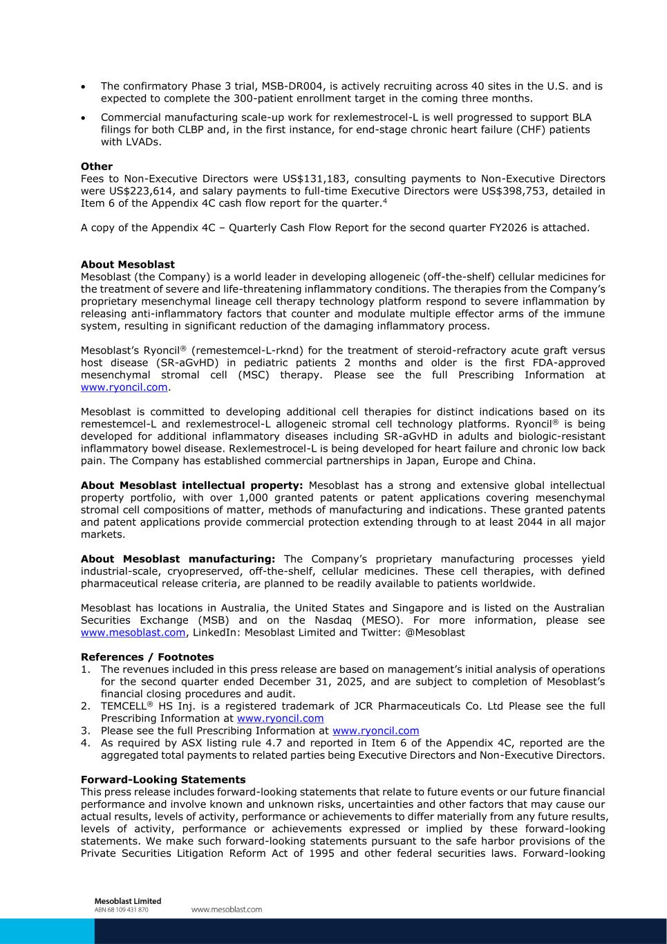 • The confirmatory Phase 3 trial, MSB-DR004, is actively recruiting across 40 sites in the U.S. and is expected to complete the 300-patient enrollment target in the coming three months. • Commercial manufacturing scale-up work for rexlemestrocel-L is well progressed to support BLA filings for both CLBP and, in the first instance, for end-stage chronic heart failure (CHF) patients with LVADs. Other Fees to Non-Executive Directors were US$131,183, consulting payments to Non-Executive Directors were US$223,614, and salary payments to full-time Executive Directors were US$398,753, detailed in Item 6 of the Appendix 4C cash flow report for the quarter.4 A copy of the Appendix 4C – Quarterly Cash Flow Report for the second quarter FY2026 is attached. About Mesoblast Mesoblast (the Company) is a world leader in developing allogeneic (off-the-shelf) cellular medicines for the treatment of severe and life-threatening inflammatory conditions. The therapies from the Company’s proprietary mesenchymal lineage cell therapy technology platform respond to severe inflammation by releasing anti-inflammatory factors that counter and modulate multiple effector arms of the immune system, resulting in significant reduction of the damaging inflammatory process. Mesoblast’s Ryoncil® (remestemcel-L-rknd) for the treatment of steroid-refractory acute graft versus host disease (SR-aGvHD) in pediatric patients 2 months and older is the first FDA-approved mesenchymal stromal cell (MSC) therapy. Please see the full Prescribing Information at www.ryoncil.com. Mesoblast is committed to developing additional cell therapies for distinct indications based on its remestemcel-L and rexlemestrocel-L allogeneic stromal cell technology platforms. Ryoncil® is being developed for additional inflammatory diseases including SR-aGvHD in adults and biologic-resistant inflammatory bowel disease. Rexlemestrocel-L is being developed for heart failure and chronic low back pain. The Company has established commercial partnerships in Japan, Europe and China. About Mesoblast intellectual property: Mesoblast has a strong and extensive global intellectual property portfolio, with over 1,000 granted patents or patent applications covering mesenchymal stromal cell compositions of matter, methods of manufacturing and indications. These granted patents and patent applications provide commercial protection extending through to at least 2044 in all major markets. About Mesoblast manufacturing: The Company’s proprietary manufacturing processes yield industrial-scale, cryopreserved, off-the-shelf, cellular medicines. These cell therapies, with defined pharmaceutical release criteria, are planned to be readily available to patients worldwide. Mesoblast has locations in Australia, the United States and Singapore and is listed on the Australian Securities Exchange (MSB) and on the Nasdaq (MESO). For more information, please see www.mesoblast.com, LinkedIn: Mesoblast Limited and Twitter: @Mesoblast References / Footnotes 1. The revenues included in this press release are based on management’s initial analysis of operations for the second quarter ended December 31, 2025, and are subject to completion of Mesoblast’s financial closing procedures and audit. 2. TEMCELL® HS Inj. is a registered trademark of JCR Pharmaceuticals Co. Ltd Please see the full Prescribing Information at www.ryoncil.com 3. Please see the full Prescribing Information at www.ryoncil.com 4. As required by ASX listing rule 4.7 and reported in Item 6 of the Appendix 4C, reported are the aggregated total payments to related parties being Executive Directors and Non-Executive Directors. Forward-Looking Statements This press release includes forward-looking statements that relate to future events or our future financial performance and involve known and unknown risks, uncertainties and other factors that may cause our actual results, levels of activity, performance or achievements to differ materially from any future results, levels of activity, performance or achievements expressed or implied by these forward-looking statements. We make such forward-looking statements pursuant to the safe harbor provisions of the Private Securities Litigation Reform Act of 1995 and other federal securities laws. Forward-looking